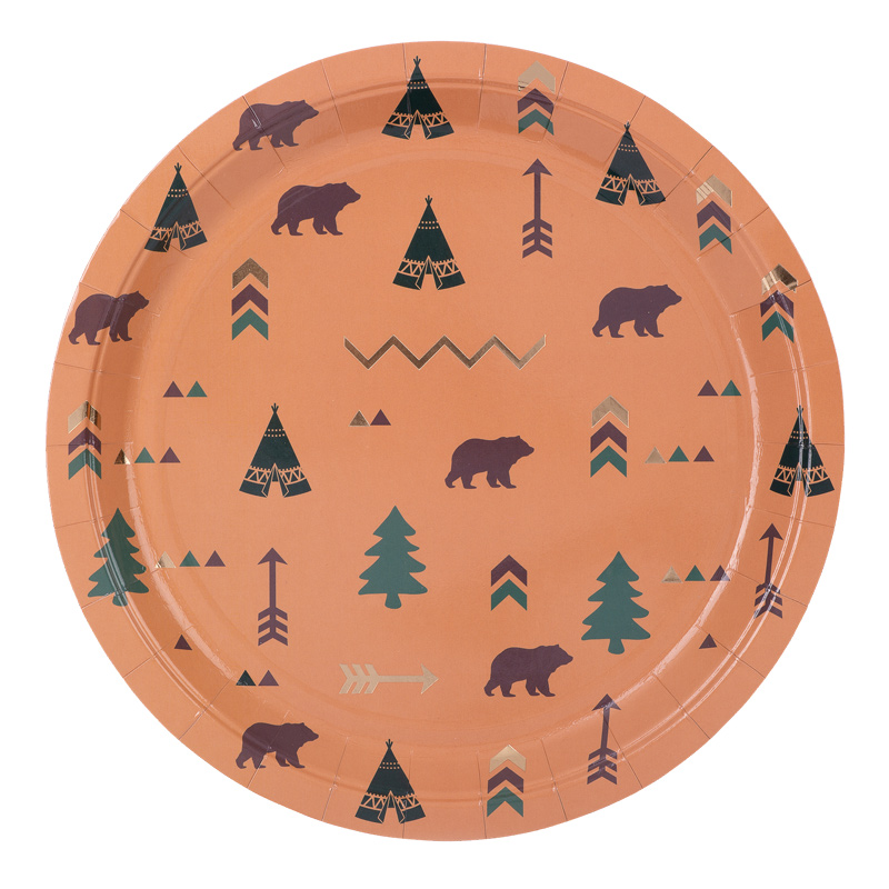 Lot de 8 assiettes cartonnées Thème Indian Forest Motifs: Tipis, flèches, ours bruns, sapin et formes tribales Coloris: marron, vert et dorures Diamètre : 23 cm Vaisselle jetable pour table festive (goûter d’anniversaire, brunch, baptême, baby shower) Design Arty Fête Factory