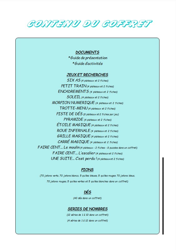 Une manière originale pour découvrir les nombres et apprendre à compter. Les nombreux jeux et recherches numériques s’adaptent aux compétences des enfants tout au long de leur scolarité élémentaire. Idéal pour un ou plusieurs groupes, vous disposez d’un matériel de base pour mettre en place immédiatement votre activité. . CRÉATION – ESPACES ÉDUCATIFS & CEMÉA