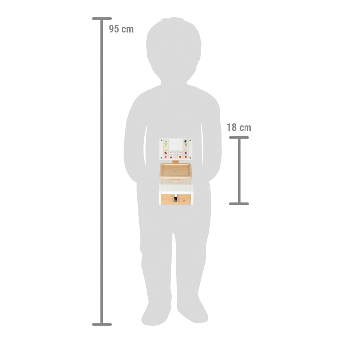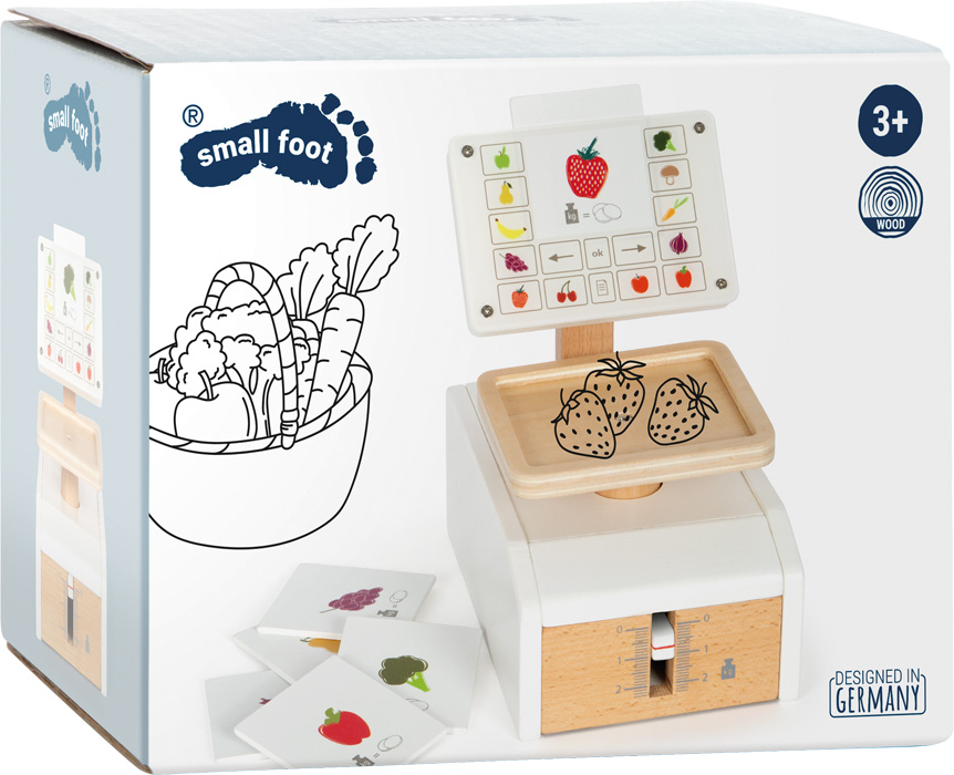 L’appareil se distingue par son large plateau de pesée et son écran protégé par une vitre acrylique, sous lequel on peut insérer 6 cartes recto-verso illustrant divers fruits et légumes. Le design épuré et le fonctionnement mécanique (sans piles) en font un outil durable pour les coins marchande, permettant aux enfants de peser leurs aliments factices et d’imiter les gestes du quotidien avec précision.