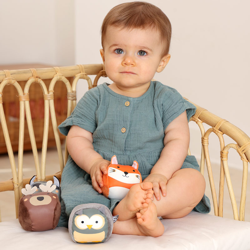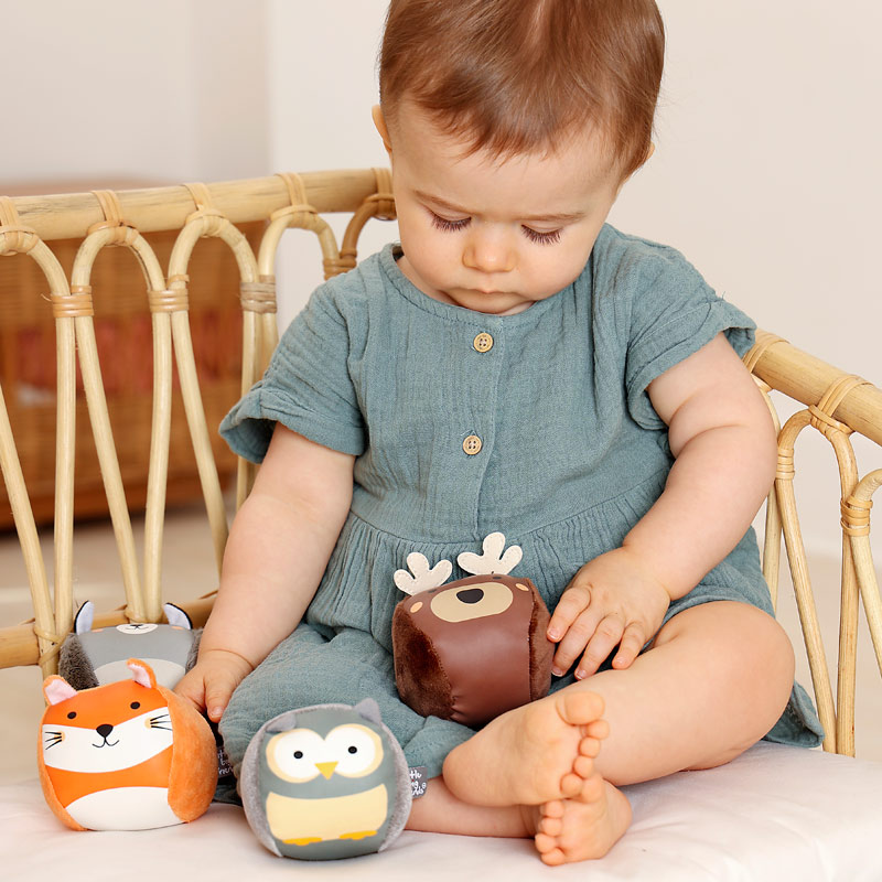 Set de 4 balles doudous Roly Poly Thème: Animaux de la Forêt (cerf, raton-laveur, renard et chouette) Jouets d’éveil pour bébé Matière souple et douce, sans PVC Différentes textures 4 sons de grelots Convient dès la naissance Design français, Little Big Friends