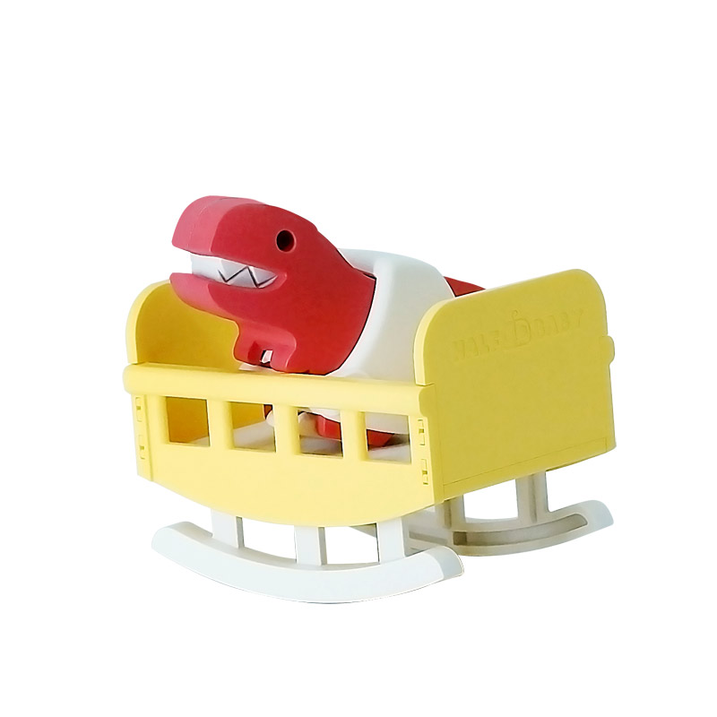 Bébé T-rex rouge et son berceau à bascule (jaune)