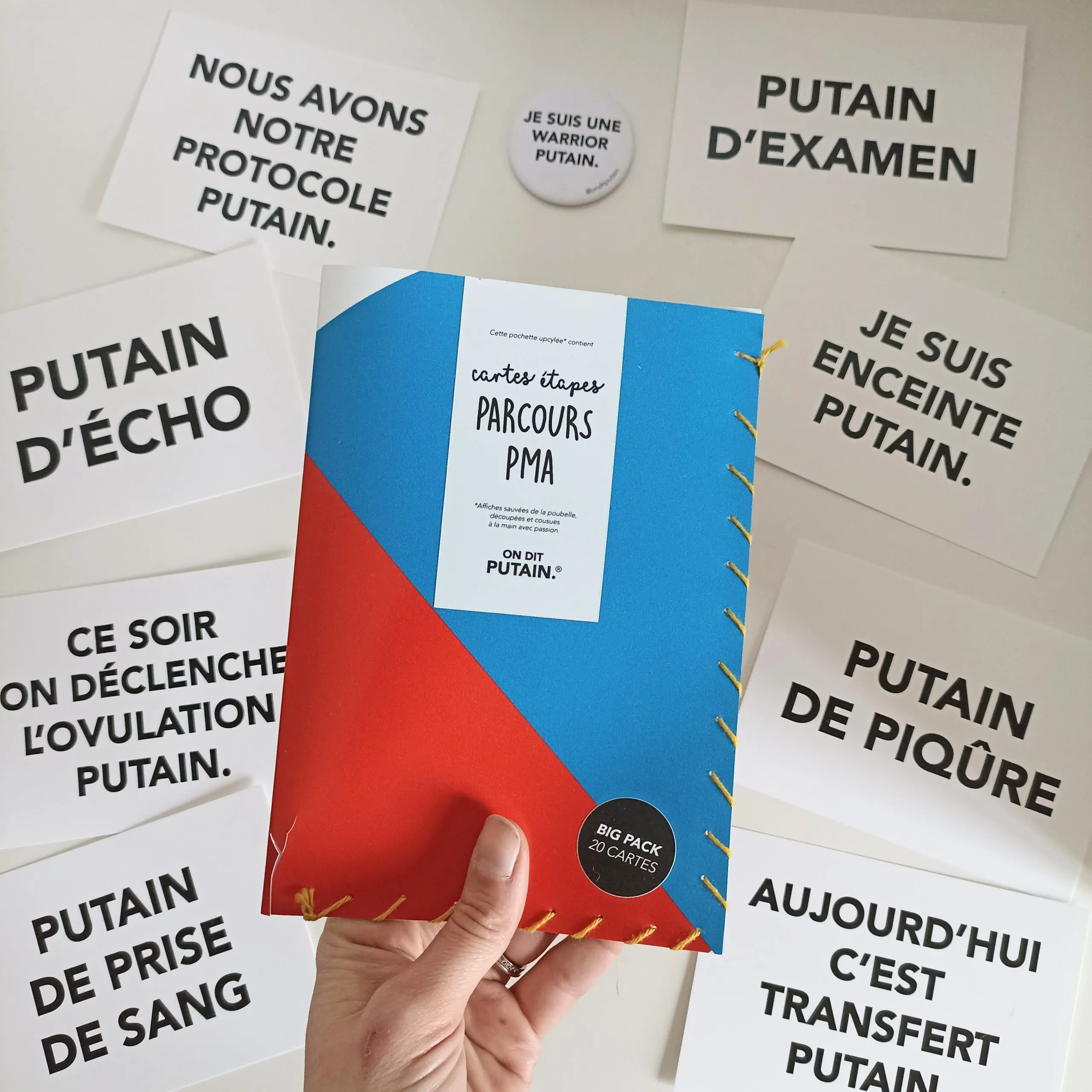 Pack “On dit Putain” 💥 – 20 cartes étapes PMA + magnet “Je suis une warrior putain”.Un lot engagé et plein d’humour, imprimé en France et livré dans une pochette upcyclée unique.