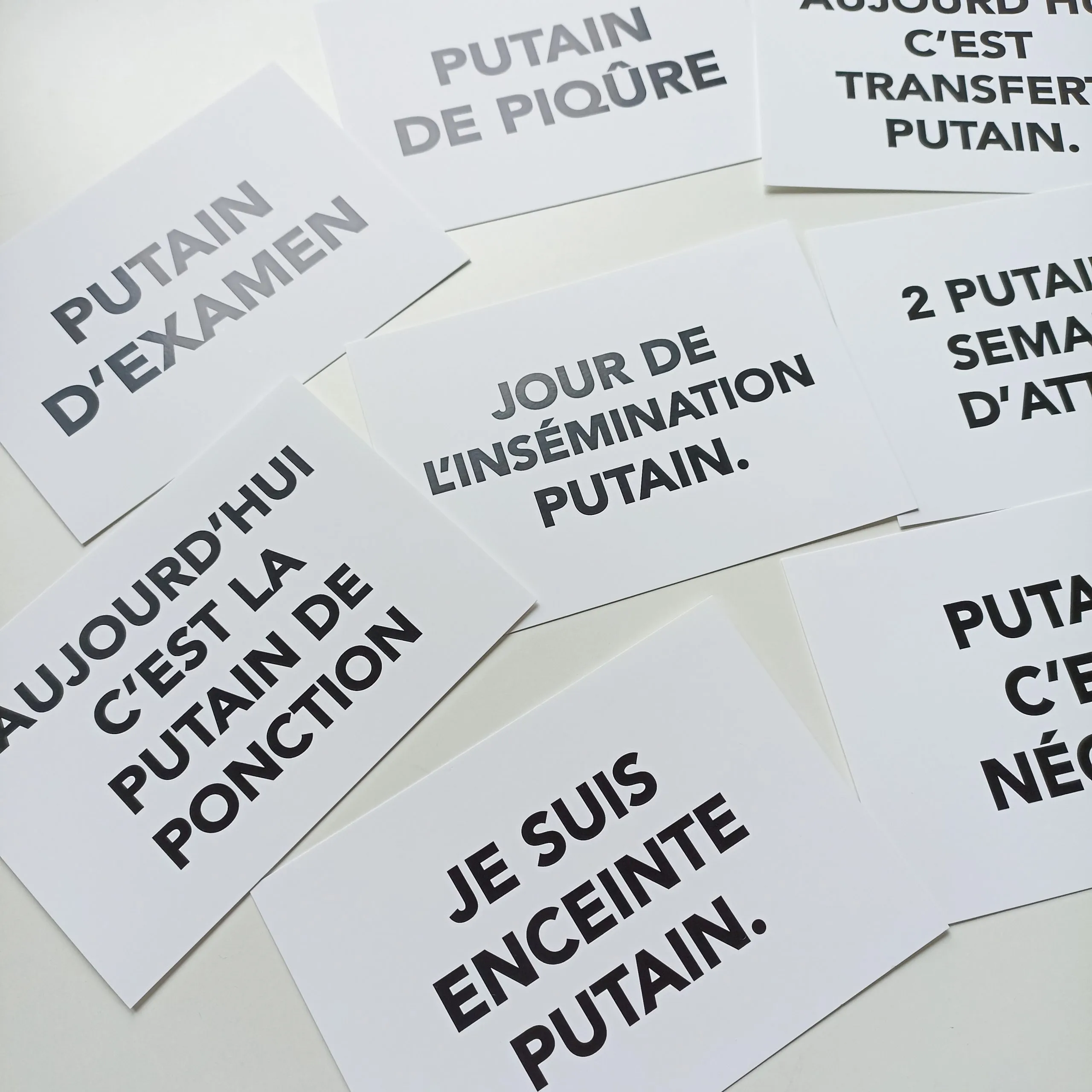 Du spermogramme à la ponction, jusqu’à la fameuse “2 putain de semaines d’attente”, chaque carte raconte une étape essentielle de ton aventure PMA.