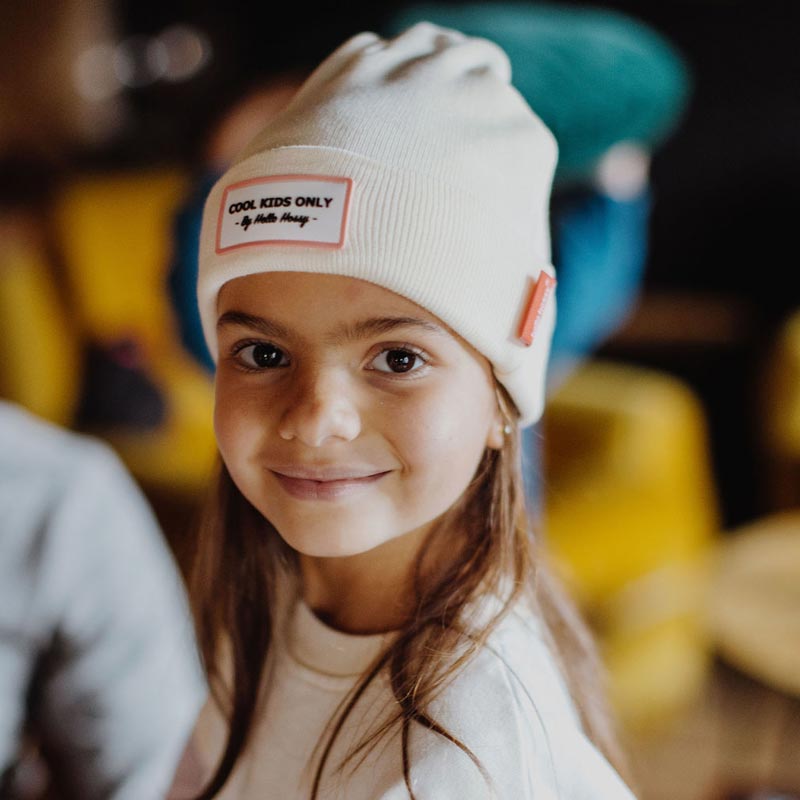 Bonnet Urban enfant Cream Coloris: blanc crème Étiquette message: Cool Kids Only Matériaux: 100% Coton 3 tailles enfant: 9-18 mois, 2-5 ans et +6ans Également disponible en version adulte Cool Mums Jolie boîte cartonnée Design: Hello Hossy, France