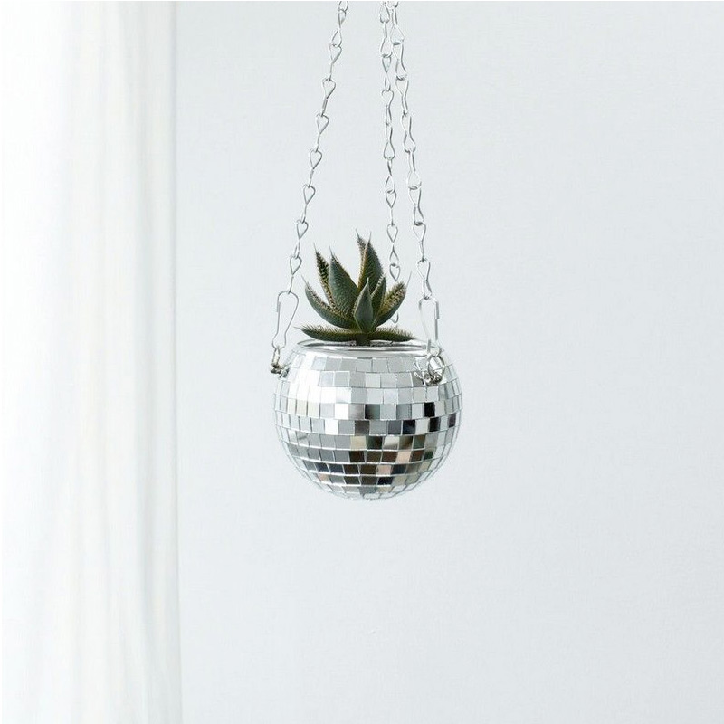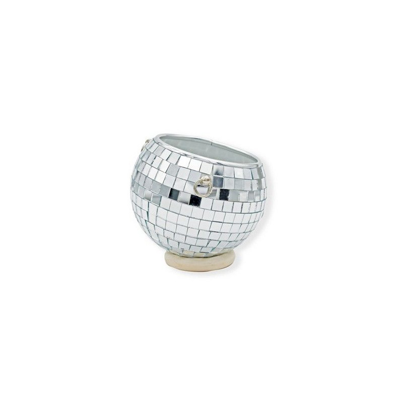 Sublimez vos plantes dans ce superbe cache-pot à suspendre ou à poser en forme de boule disco. Installé près d’une fenêtre, le soleil reflètera dans les nombreuses facettes miroirs du cache-pot et créera ainsi une ambiance disco et magique dans votre intérieur. Un chouette et original cadeau à offrir à vos proches, pour un anniversaire, Noël, une crémaillère… Également disponible en plus grand format 15cm.