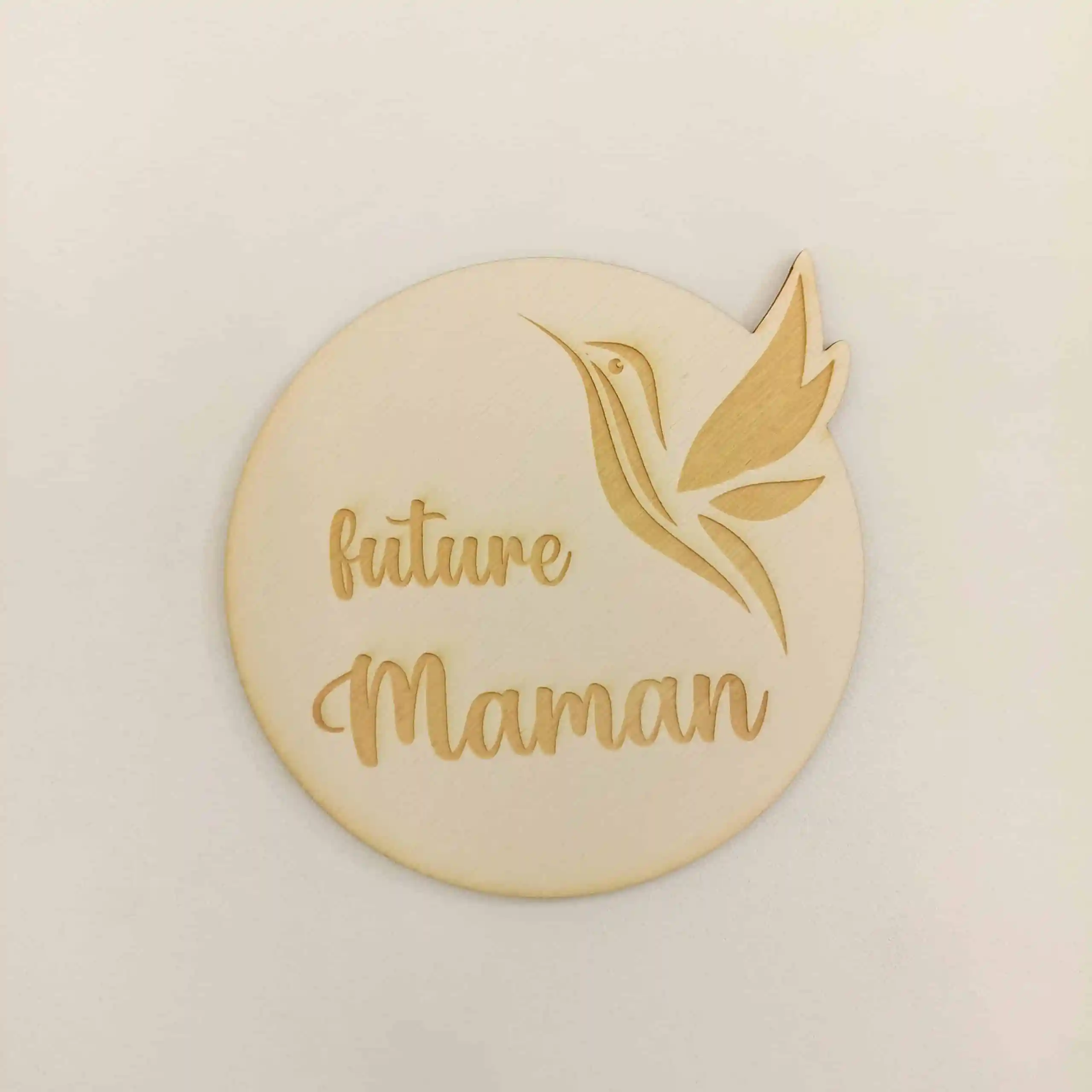 Carte en bois « Future maman » Dimensions : Disque de diamètre de 10cm Articles réalisés par BABY HOPE en collaboration avec le Fablab La Bobine de Auch
