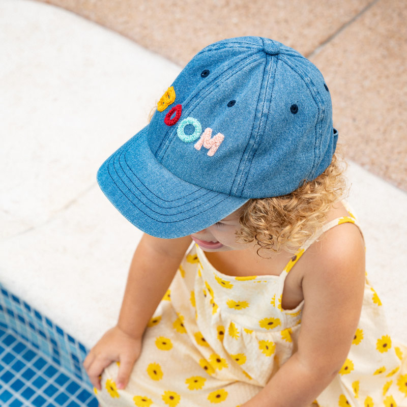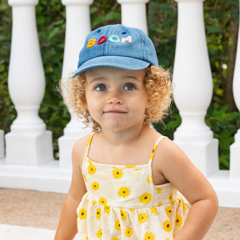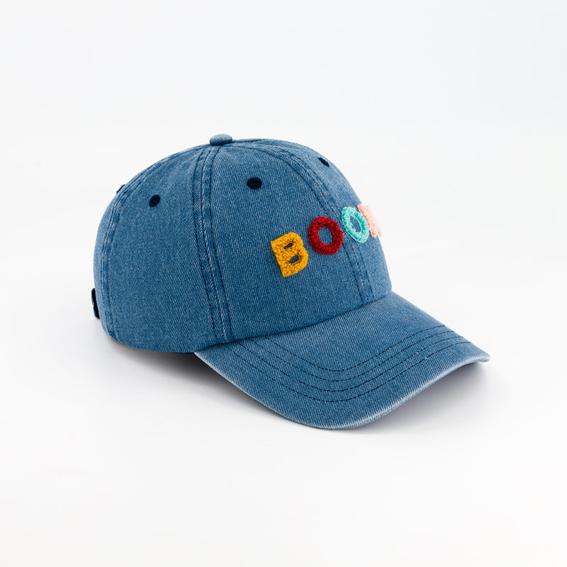 Casquette bébé et enfant Broderie bouclettes «BOOM» Coloris: bleu jean et lettres brodées jaune, rouge, menthe et rose clair Matériaux : 100% coton Accessoire mode printemps-été Design Chamaye 3 tailles de tour de tête : 9-24 mois (44-49cm), 3-6 ans (48-52cm) et 7-12 ans (51-56cm) Fermeture velcro pour ajuster la taille