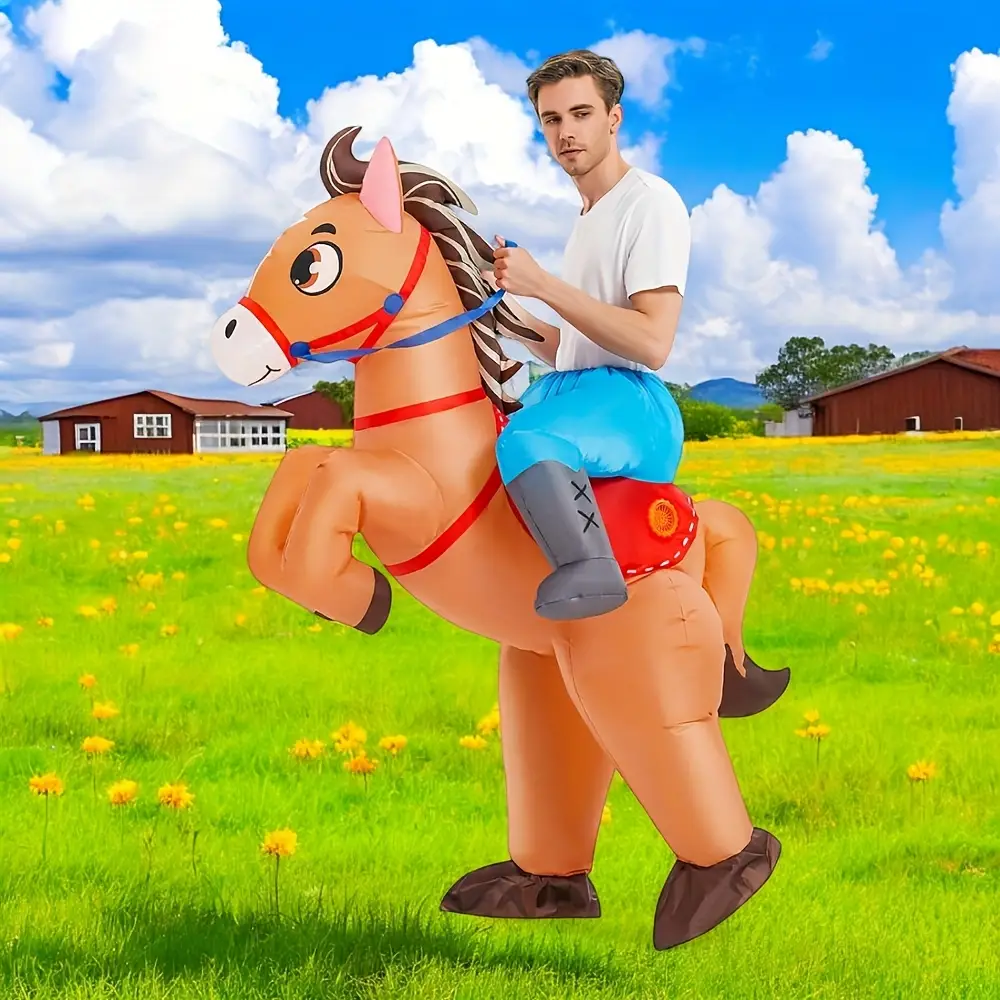 - Misez sur l’effet comique immédiat avec ce costume de cheval gonflable ultra ludique, conçu pour faire rire à coup sûr.