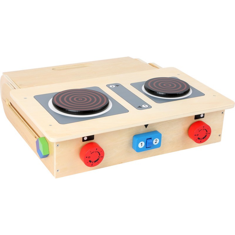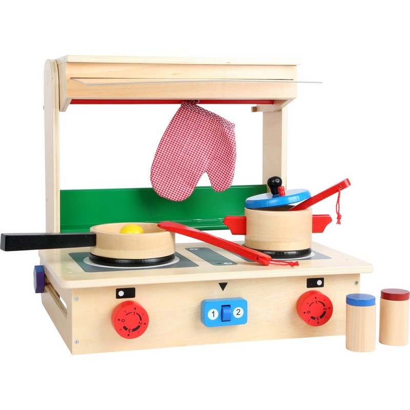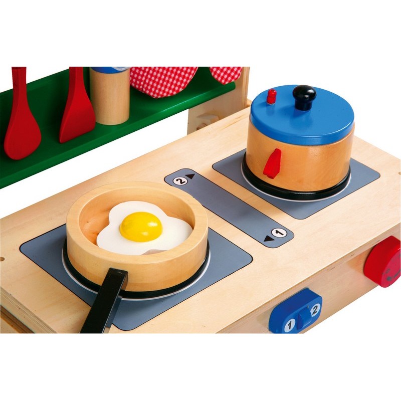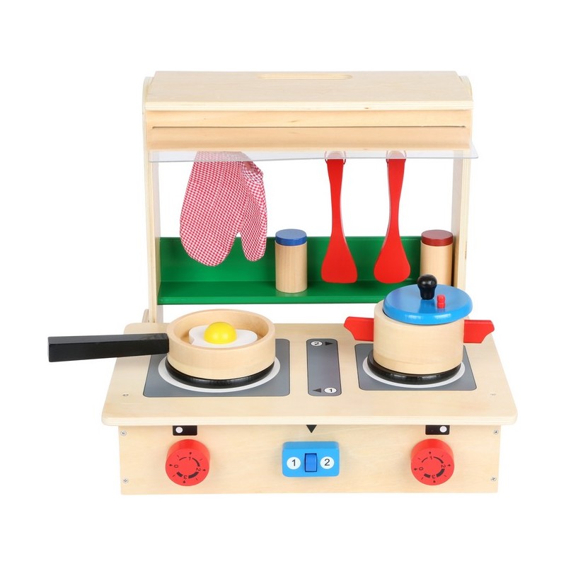 Cette cuisine de voyage comprenant des régulateurs avec bruit, une «hotte aspirante» avec plaque en plexiglas extractible, une étagère à épices et une tringle pour accrocher cuillères, spatules et gants, permet de préparer des repas délicieux comme un œuf sur le plat et un pot-au-feu. Cette cuisine pour enfants se plie en un tour de main et se laisse emporter en voyage comme une valise. Cette cuisine itinérante a également 11 accessoires et permet de préparer des repas de fête !