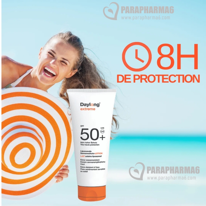 DAYLONG EXTREME SPF50+ est un lait solaire liposomal offrant une très haute protection SPF 50+ contre les UVA, UVB et les infrarouges. Conçu pour les peaux sensibles et réactives, il hydrate, nourrit et protège la peau tout en prévenant le vieillissement cutané prématuré grâce à la vitamine E. Points forts : Protection longue durée et photo-stable Invisible sur la peau, sans traces blanches Texture légère, absorption rapide Résistant à l’eau Formule haute tolérance : hypoallergénique, non comédogène, sans parfum, parabènes ni octocrylène Ne pique pas les yeux Idéal pour les expositions prolongées, les activités sportives ou aquatiques.