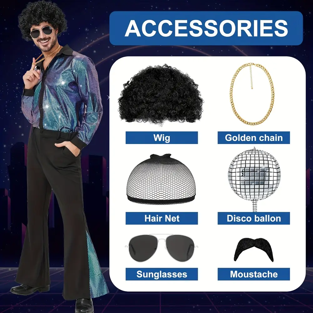 - Composé de 8 pièces, cet ensemble disco homme avec accessoires est prêt à porter : rien à ajouter