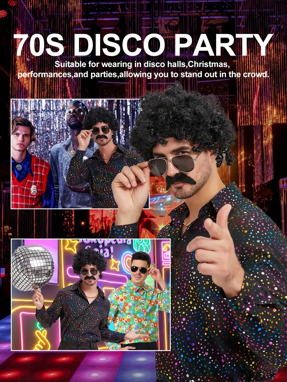 - Complété par une perruque funky, fausse barbe, ballon, chaîne et lunettes, ce look rétro 8 pièces homme attire tous les regards.