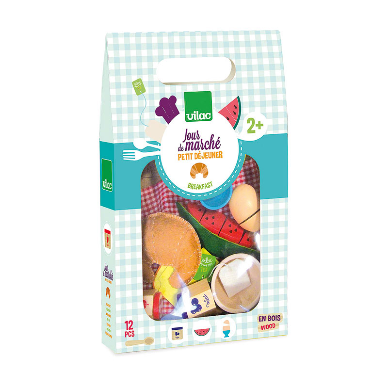 Préparez un petit déjeuner déjeuner digne d’un hôtel 5 étoiles avec ce superbe set de dinette Jour de Marché spécial petit déjeuner. Sucrés et salés, les 12 éléments en bois et tissu permettront à vos enfants de servir de nombreuses variations de brunch et petit déj’. Oeuf à la coque et mouillette, pastèque à découper, tartine, confitures, fromage, croissant, le tout accompagné d’une bonne tasse de thé (véritable coup de cœur pour le sachet de thé). Un coffret de cuisine pour des petits qui prendront un réel plaisir à imiter les plus grands (peut-être même à venir vous servir ces…
