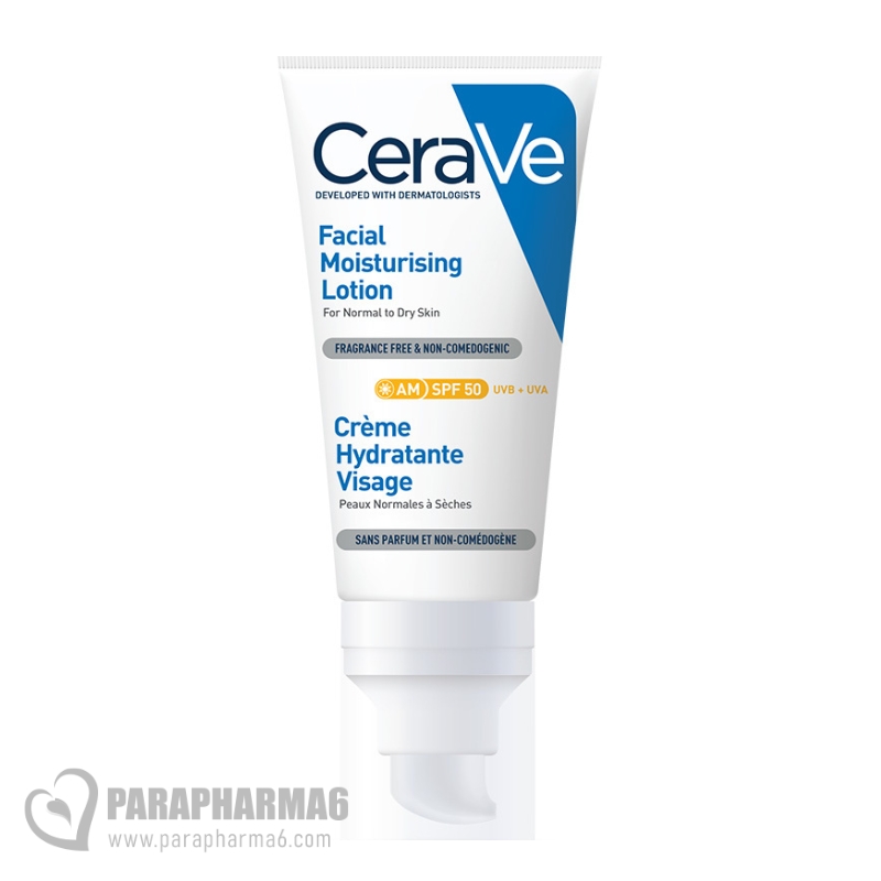 La Crème Hydratante Visage SPF50 de CeraVe est un soin qui hydrate les peaux normales à sèches. Cette crème à la texture légère non collante s’applique sur le visage et le cou pour une peau hydratée toute la journée. Sa protection UV SPF50 bloque les rayons UVA et UVB afin de protéger la peau du soleil.