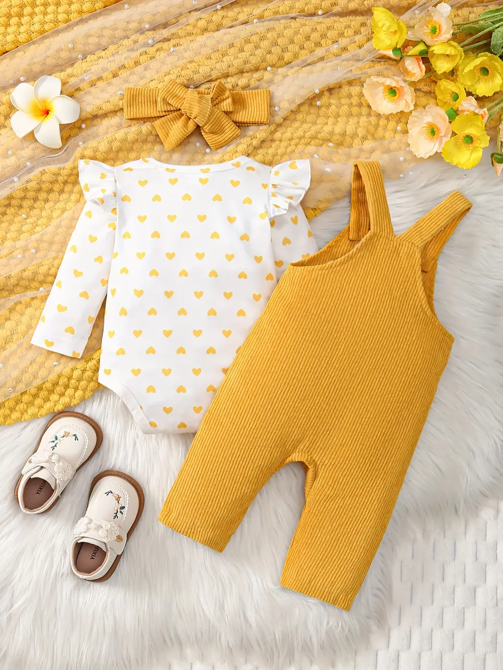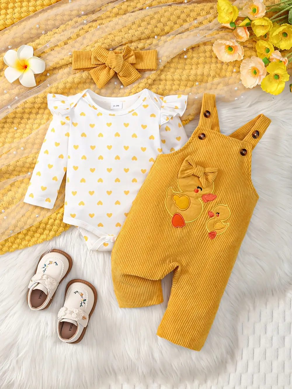 Ensemble 3 pièces bébé fille – barboteuse cœur, salopette velours, bandeau assorti