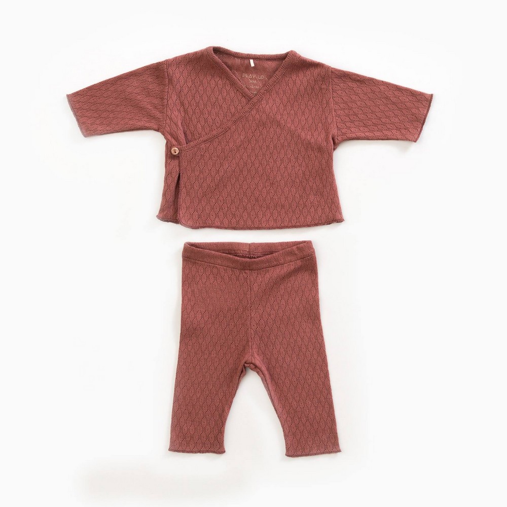 - Cet ensemble est fabriqué à partir de coton biologique de manière éthique. Le gilet se ferme en cache cœur avec un petit bouton en bois. Le pantalon, quant à lui, comporte un élastique à la taille. L’ensemble est joliment décoré de motifs en forme de losange pour mettre votre bébé, fille ou garçon à la pointe de la mode.