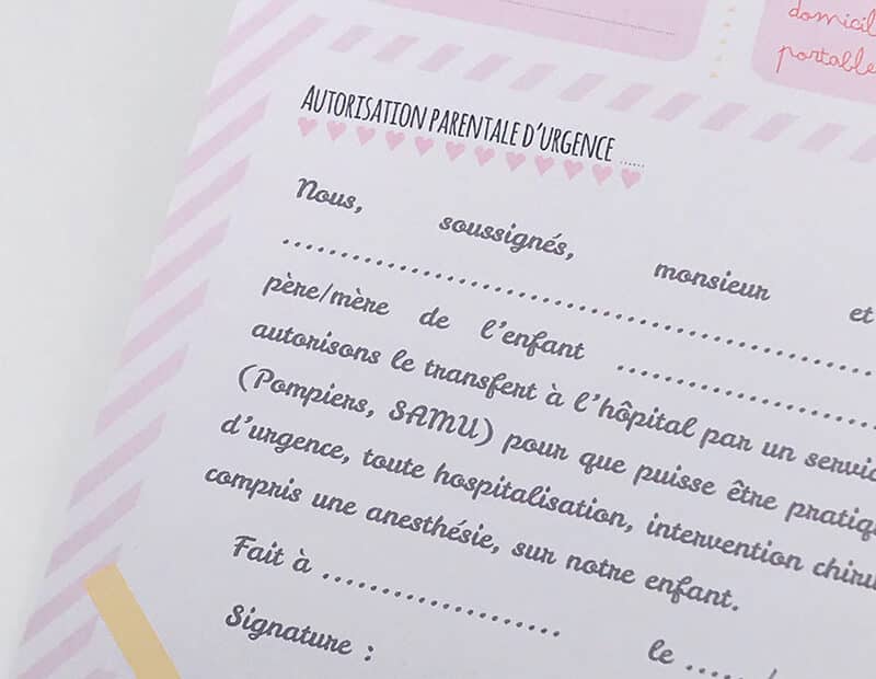 Ce support prévoit également l’autorisation parentale nécessaire en cas de transport et d’hospitalisation du bout’choux.