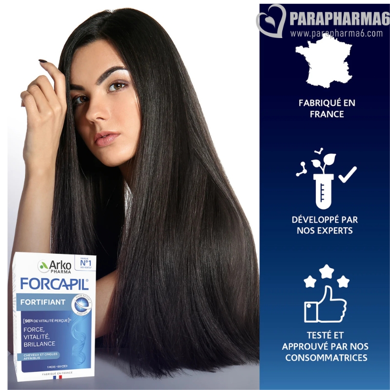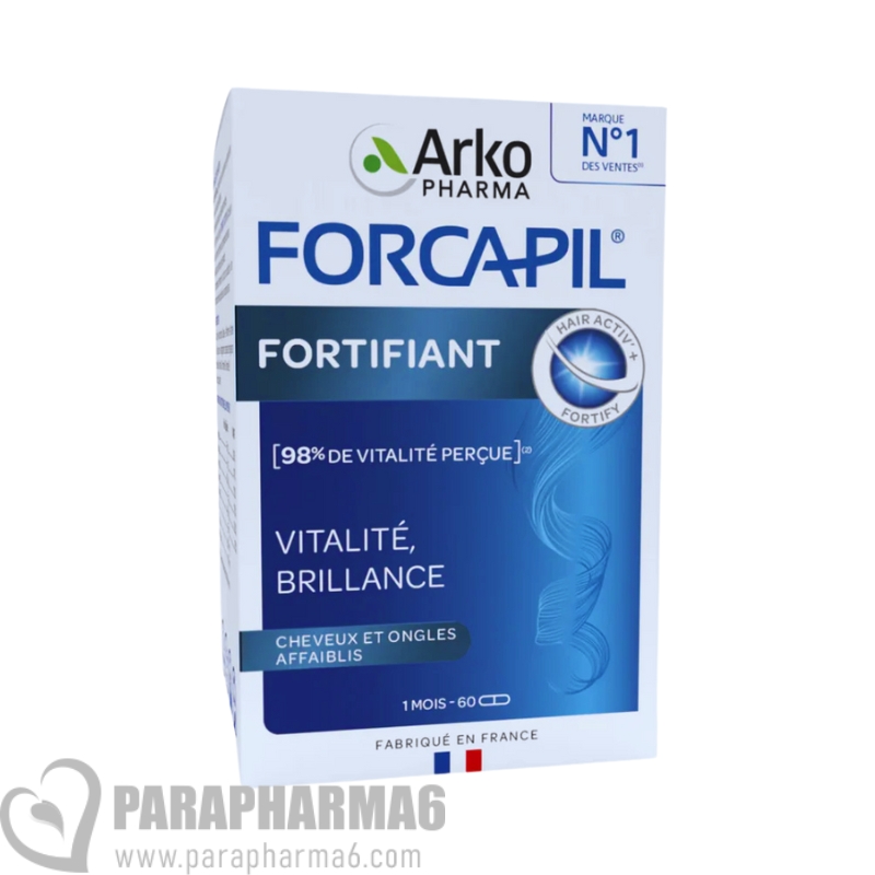 FORCAPIL® FORTIFIANT : une synergie d’actifs essentiels pour des cheveux et des ongles plus forts, plus brillants et en pleine santé. Spécialement formulé pour renforcer la vitalité capillaire, FORCAPIL® redonne souplesse et éclat à la chevelure, tout en contribuant à maintenir des cheveux sains et des ongles résistants. Expert reconnu de la santé capillaire, FORCAPIL® associe le complexe exclusif HAIR ACTIV’+ FORTIFY – à base de vitamines B5, B6, B8, B9 et de zinc – pour fortifier la fibre capillaire de la racine jusqu’aux pointes.