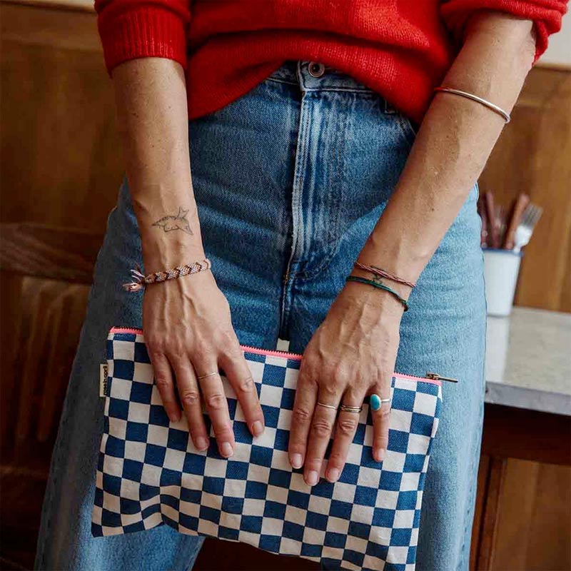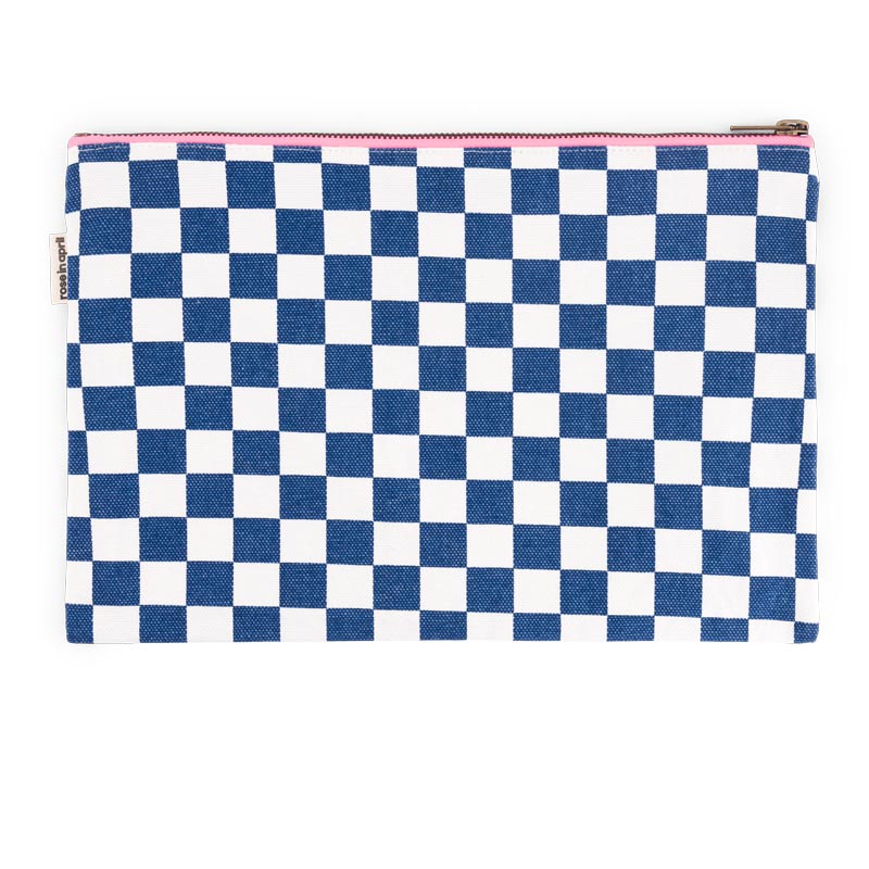 Grande Pochette Lili Modèle: Damier bleu/écru Zip rose fluo Effet coton lavé Dimensions: 30 cm x 21 cm Matériaux: Composition: 100% coton Intérieur doublé en coton enduit Lavable en machine à 30° Fabriqué au Portugal Design Rose in April
