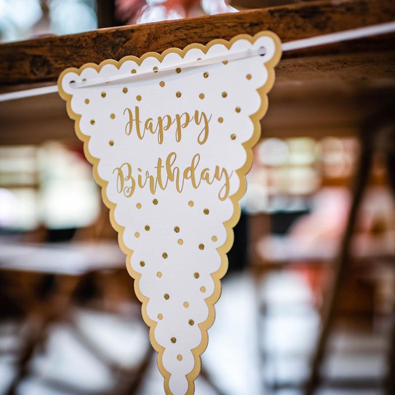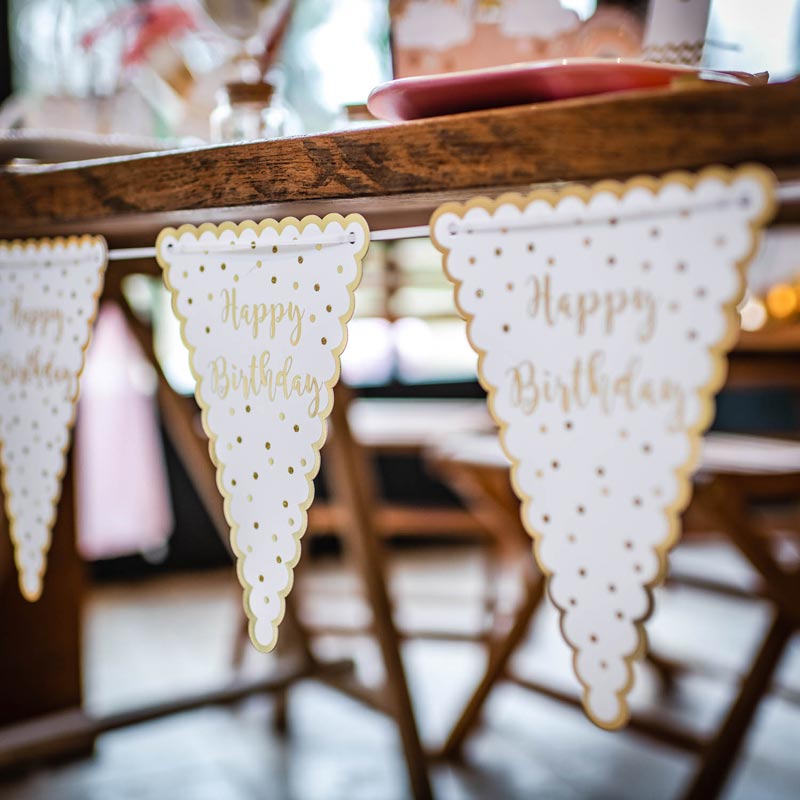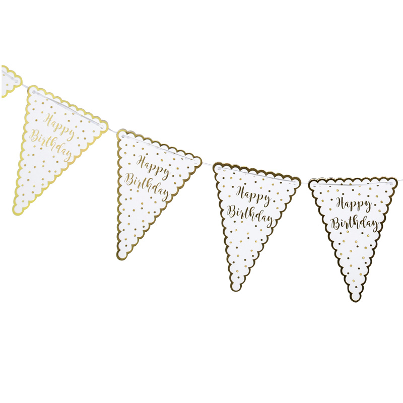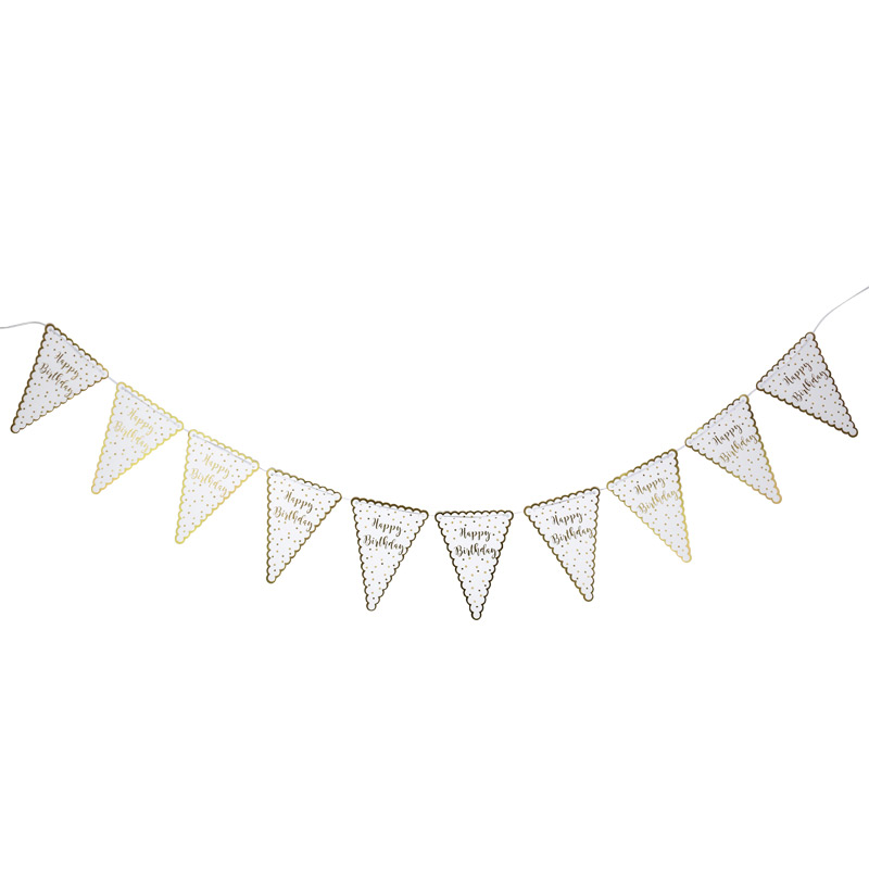 Guirlande de 10 fanions cartonnés Message: «Happy Birthday », liseré et pois dorés Coloris: blanc et or Ruban blanc Décoration pour fête d’anniversaire Design Arty Fête Factory