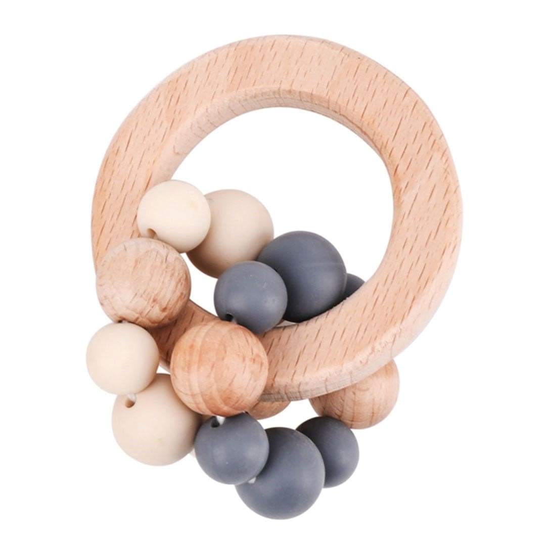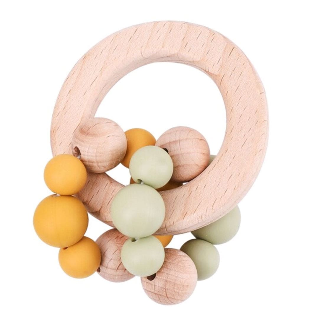 Ce hochet est constitué de deux cercles de petites boules en silicone et en bois, ainsi que d’un anneau en bois. Il permet à la fois de soulager les douleurs dentaires de bébé et de lui offrir un moment de jeu.