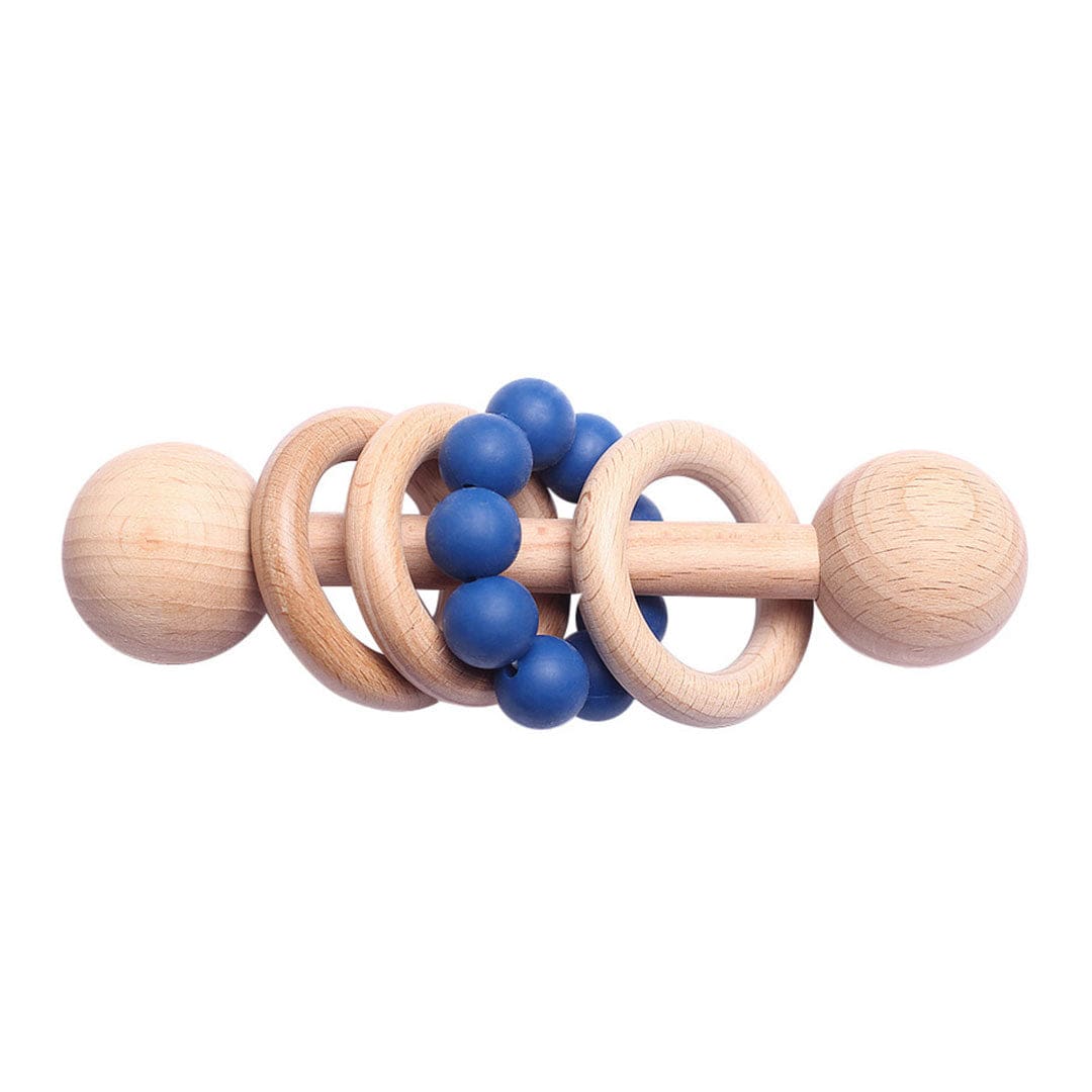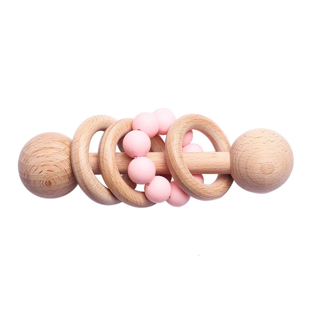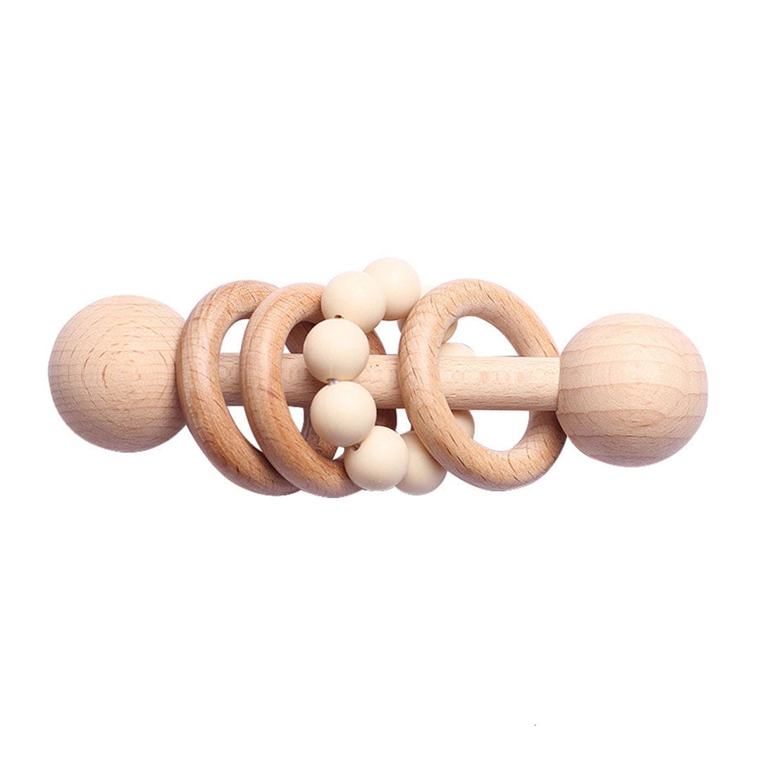 Ce hochet pour bébé, avec ses trois anneaux en bois et son collier de perles en silicone, est un jouet contemporain, sain et intelligent.