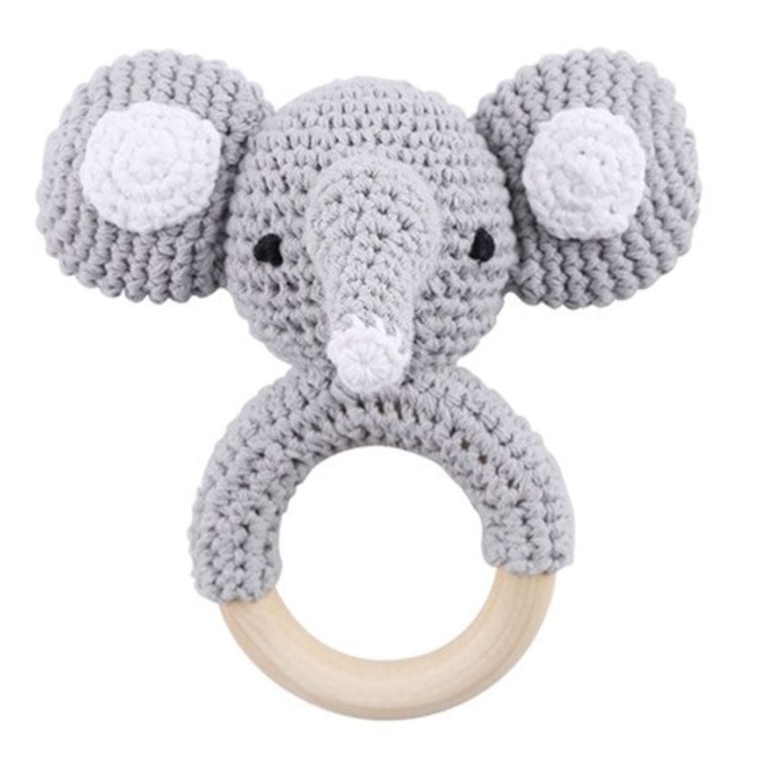 Ce hochet en bois prenant la forme d’un éléphant est enveloppé de laine, offrant une douce texture que les bébés adorent explorer.