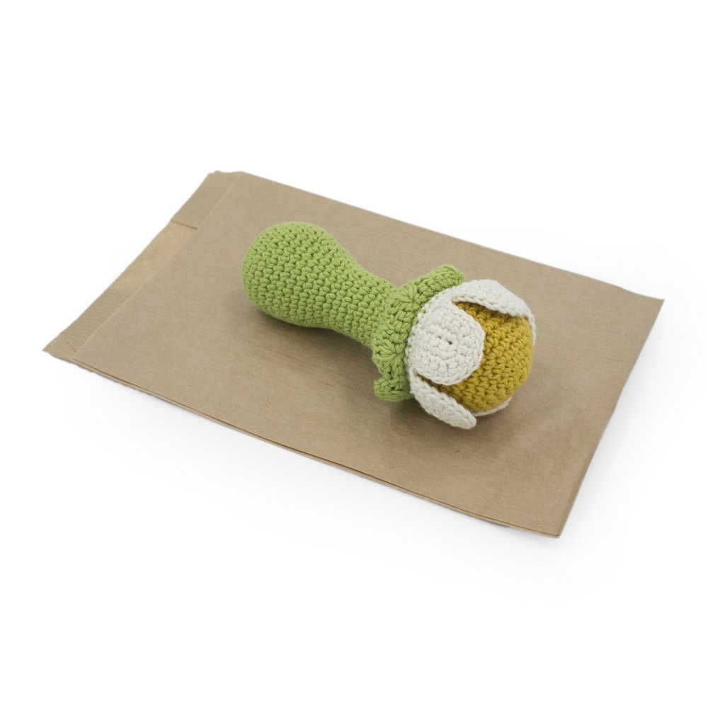 Ce hochet est fabriqué en crochet. Contrairement au tricot, le crochet est une méthode uniquement manuelle qui n’utilise ni machine, ni métier à tisser.