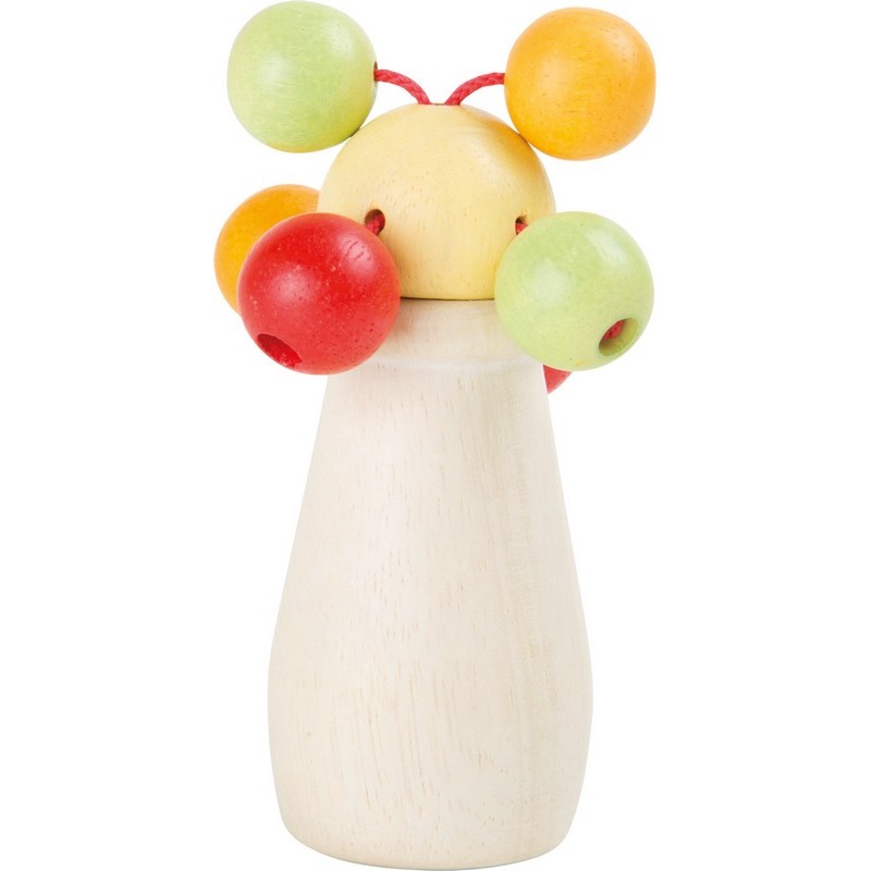 Ce hochet aux couleurs pastel est très original. De petites boules colorées se situent sur la pièce en bois de haute qualité et claquètent lorsqu´on les secoue. Il est très agréable au toucher et les tout-petits ne voudront plus le lâcher. Ce jouet premier âge et ses peintures résistent à la salive. Il développe la motricité de l´enfant. Il se nettoie à l´aide d´un chiffon humide.
