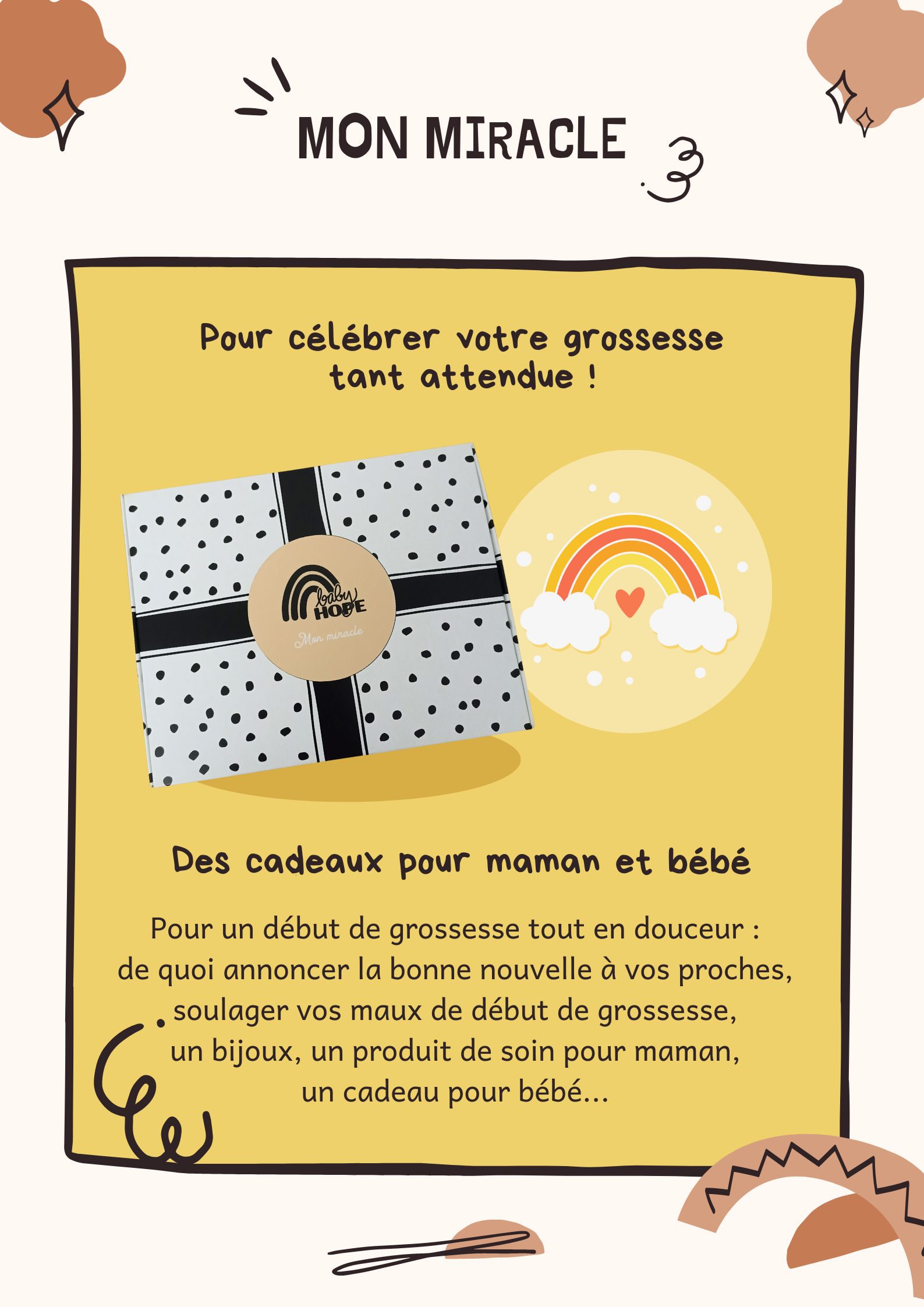 Découvrez les HOPE BOX ! Des box pour vous accompagner pendant toutes les étapes clefs de votre parcours PMA. La box « Mon Miracle » est la box pour célébrer votre grossesse tant rêvée ! Ca y est vous venez de découvrir que vous êtes enceinte et vous souhaitez vous offrir un cadeau pour fêter ce beau moment ! Une box pour vous chouchouter dès le début. Box adaptée pour le tout début de la grossesse car vous y trouverez à l’intérieur des produits pour soulager vos premiers maux de grossesse, des cadeaux pour annoncer votre grossesse à vos proches, des petites…