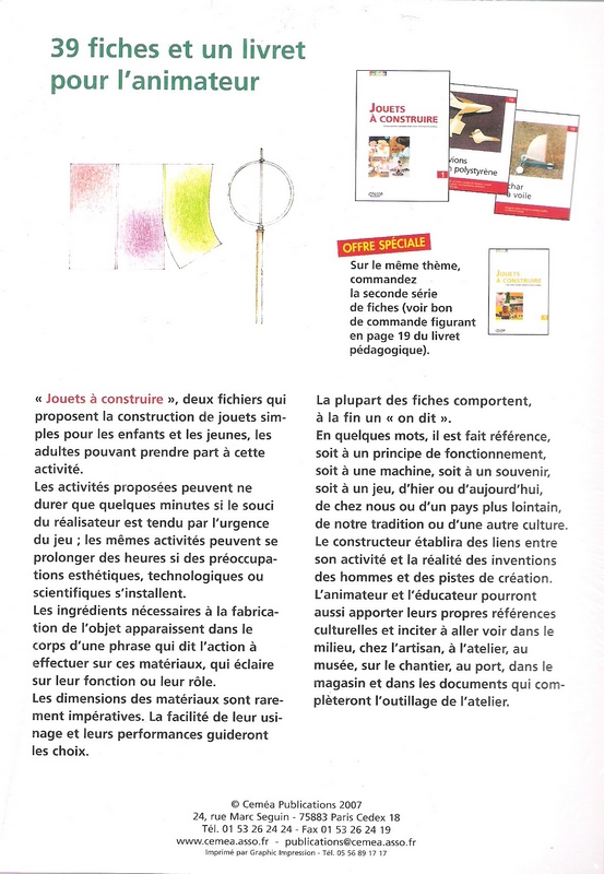 Ces fiches pédagogiques proposent la construction de jouets simples pour les enfants et les jeunes, les adultes pouvant prendre part à cette activité. Les activités proposées peuvent ne durer que quelques minutes si le souci du réalisateur est tendu par l’urgence du jeu. Les mêmes activités peuvent se prolonger des heures si des préoccupations esthétiques, technologiques ou scientifiques s’installent. Les ingrédients nécessaires à la fabrication de l’objet apparaissent dans le corps d’une phrase qui dit l’action à effectuer sur ces matériaux, qui éclaire sur leur fonction ou leur rôle. Les dimensions des matériaux sont rarement impératives. La facilité de leur…