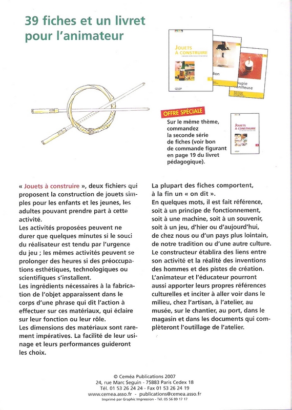 Ces fiches pédagogiques proposent la construction de jouets simples pour les enfants et les jeunes, les adultes pouvant prendre part à cette activité. Les activités proposées peuvent ne durer que quelques minutes si le souci du réalisateur est tendu par l’urgence du jeu. Les mêmes activités peuvent se prolonger des heures si des préoccupations esthétiques, technologiques ou scientifiques s’installent. Les ingrédients nécessaires à la fabrication de l’objet apparaissent dans le corps d’une phrase qui dit l’action à effectuer sur ces matériaux, qui éclaire sur leur fonction ou leur rôle. Les dimensions des matériaux sont rarement impératives. La facilité de leur…