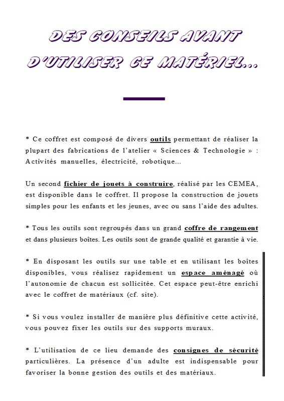 Ce coffret est composé de divers outils permettant de nombreuses réalisations. Ils sont regroupés dans un grand coffre de rangement. Ils sont de grande qualité et garantie à vie. En disposant les outils sur une table et en utilisant les boîtes disponibles, vous réalisez rapidement un espace aménagé où l’autonomie de chacun est sollicitée. Cet espace peut-être enrichi avec le coffret de matériaux (cf. site). Si vous voulez installer de manière plus définitive cette activité, vous pouvez fixer les outils sur des supports muraux Le fichier 2 de jouets à construire, réalisé par les CEMÉA, est disponible dans le coffret.…