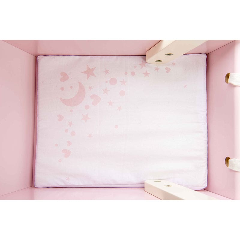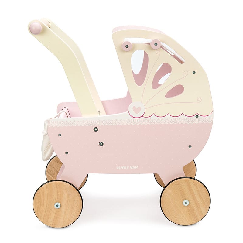 Ce landau en bois rose pâle ravira toutes les petites filles qui, quittant à peine leur phase de bébé, rêvent déjà de jouer les mamans.