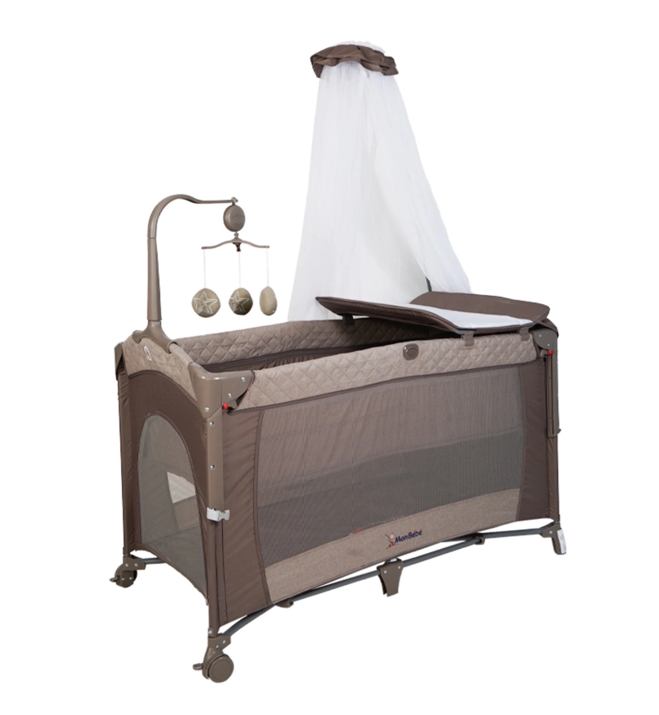 Lit parc plus plan à langer, mobile et voile moustiquaire multifonctions, très pratique !