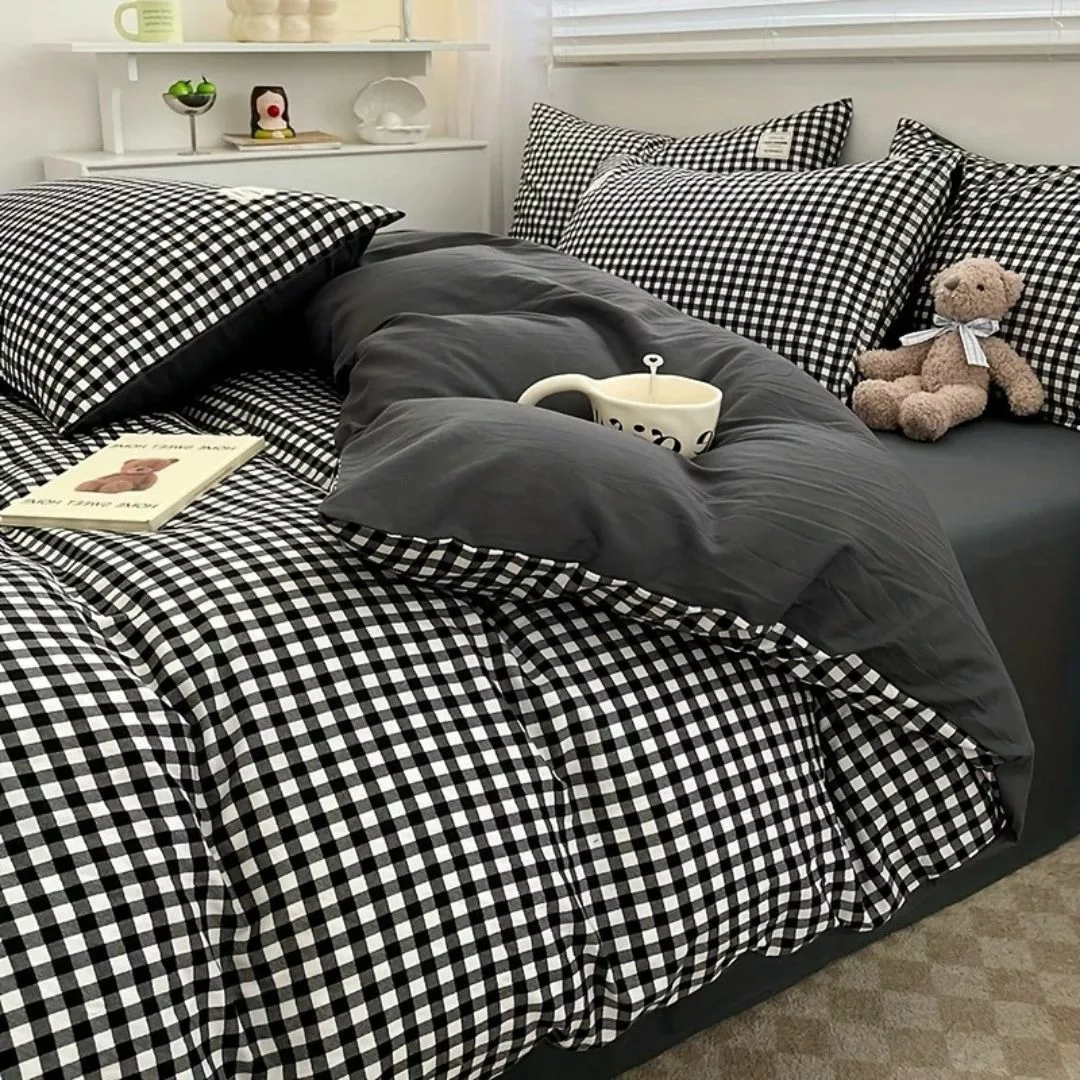 Parure de lit vichy noir moderne – Style chic et intemporel pour chambre élégante – Confort doux 100 % coton
