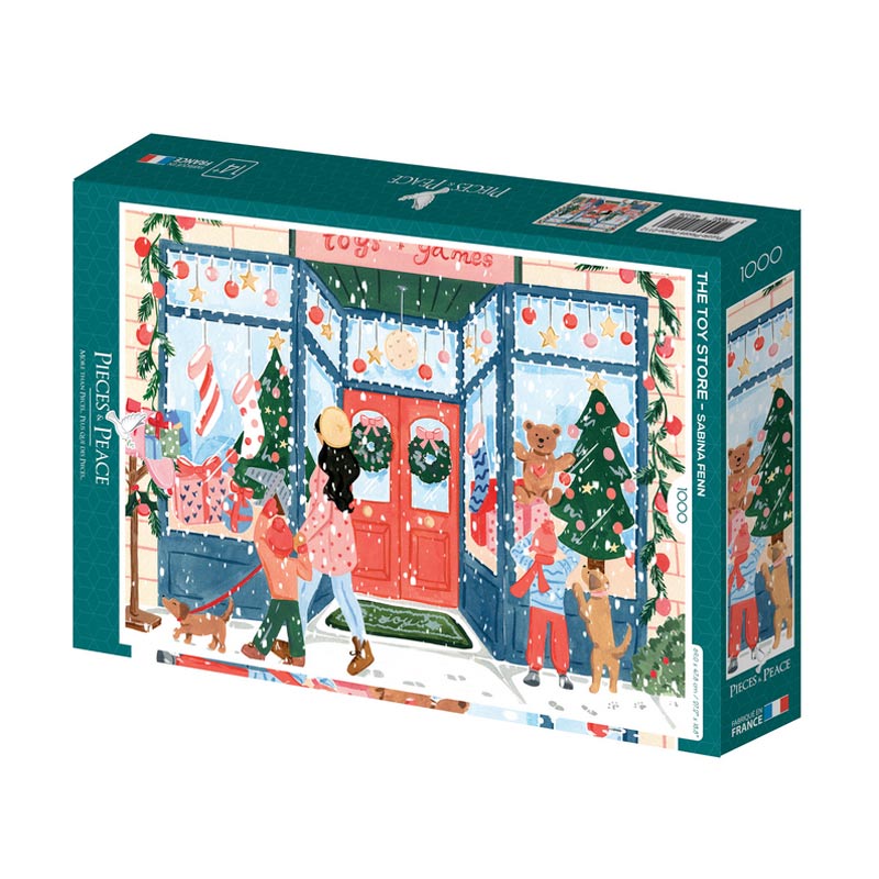 Imaginez-vous flâner en décembre, les pieds dans la neige, devant les vitrines festives d’un magasin de jouets en recomposant, seul ou en famille, l’illustration de ce superbe puzzle 1000 pièces de la marque Pieces & Peace. Fabriqué en France, ce puzzle de qualité fera un chouette cadeau d’anniversaire, de Noël, de vacances, de crémaillère… pour vos proches, adolescents ou adultes, tout particulièrement à celles et ceux qui aiment l’ambiance des fêtes de fin d’année.
