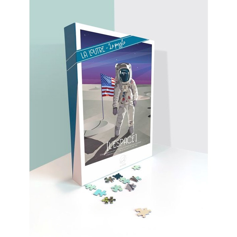 Puzzle La Loutre Modèle: L’Espace (Astronaute américain sur la lune) 1000 pièces – Format 50 cm x 70 cm Niveau Warrior, recommandé à partir de 14 ans Environ 10h d’assemblage Fabriqué en France Illustration disponible en affiche Design La Loutre, France