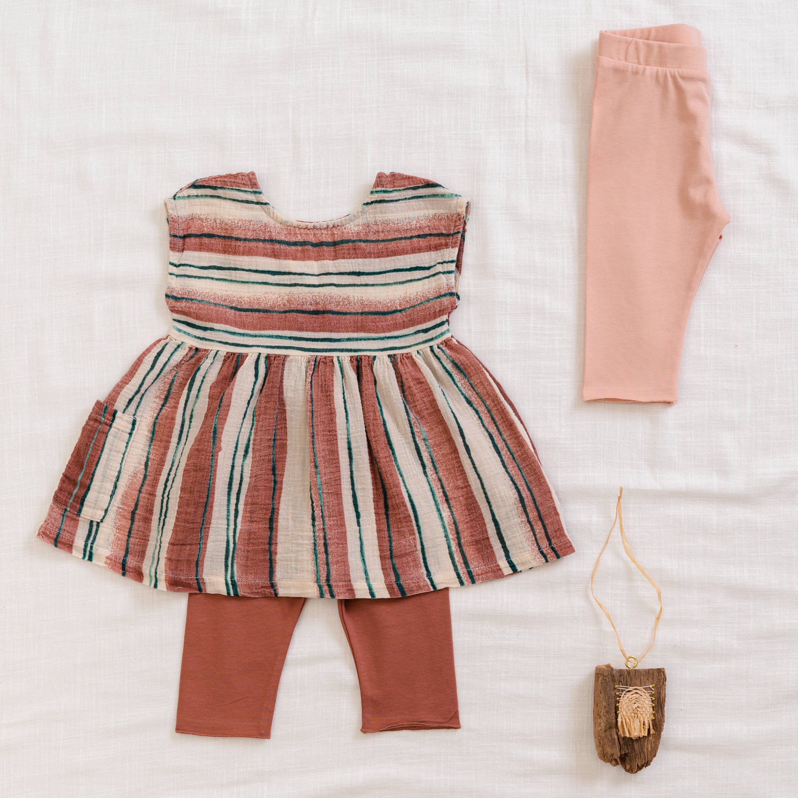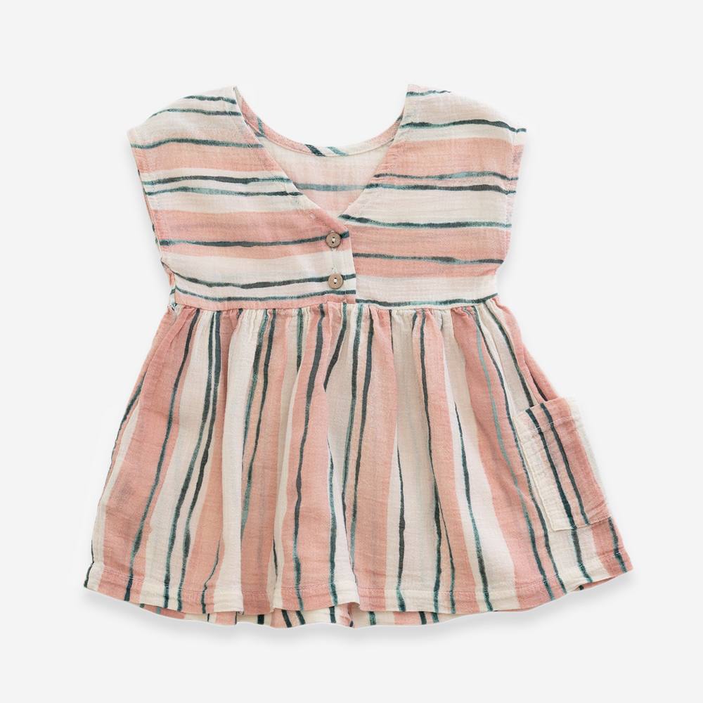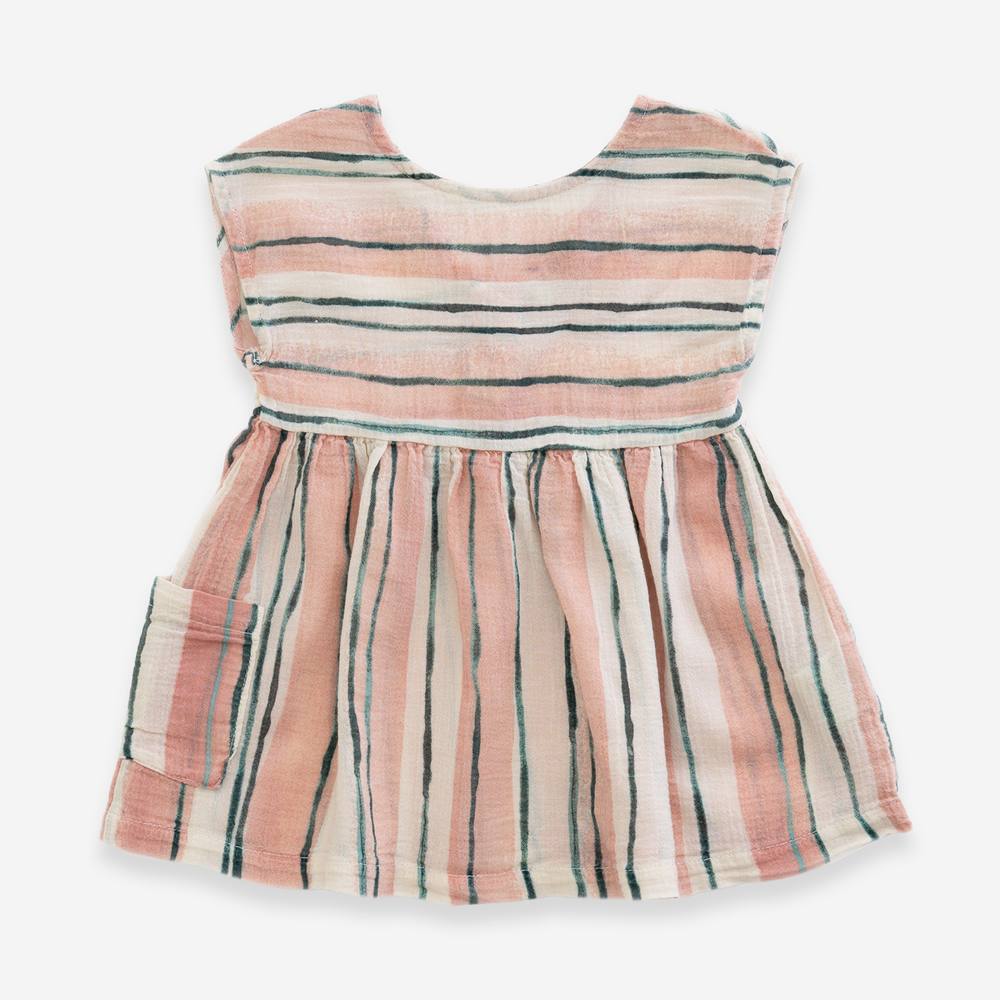 - Il est fabriqué à partir de coton de manière éthique et durable, présente un col rond, de jolies rayures colorées et se ferme avec deux petits boutons en bois à l’arrière. Les petites filles seront donc à la pointe de la mode vêtues de cette jolie petite robe bariolée.