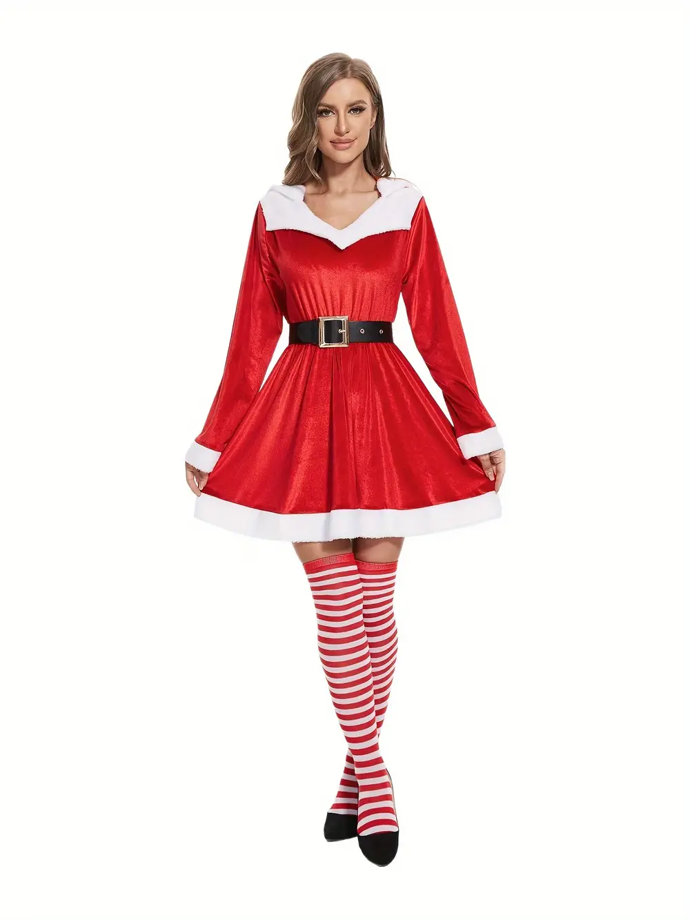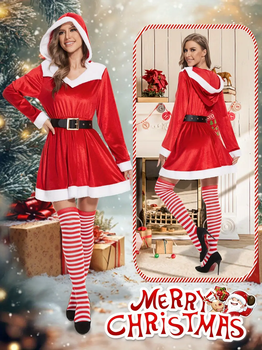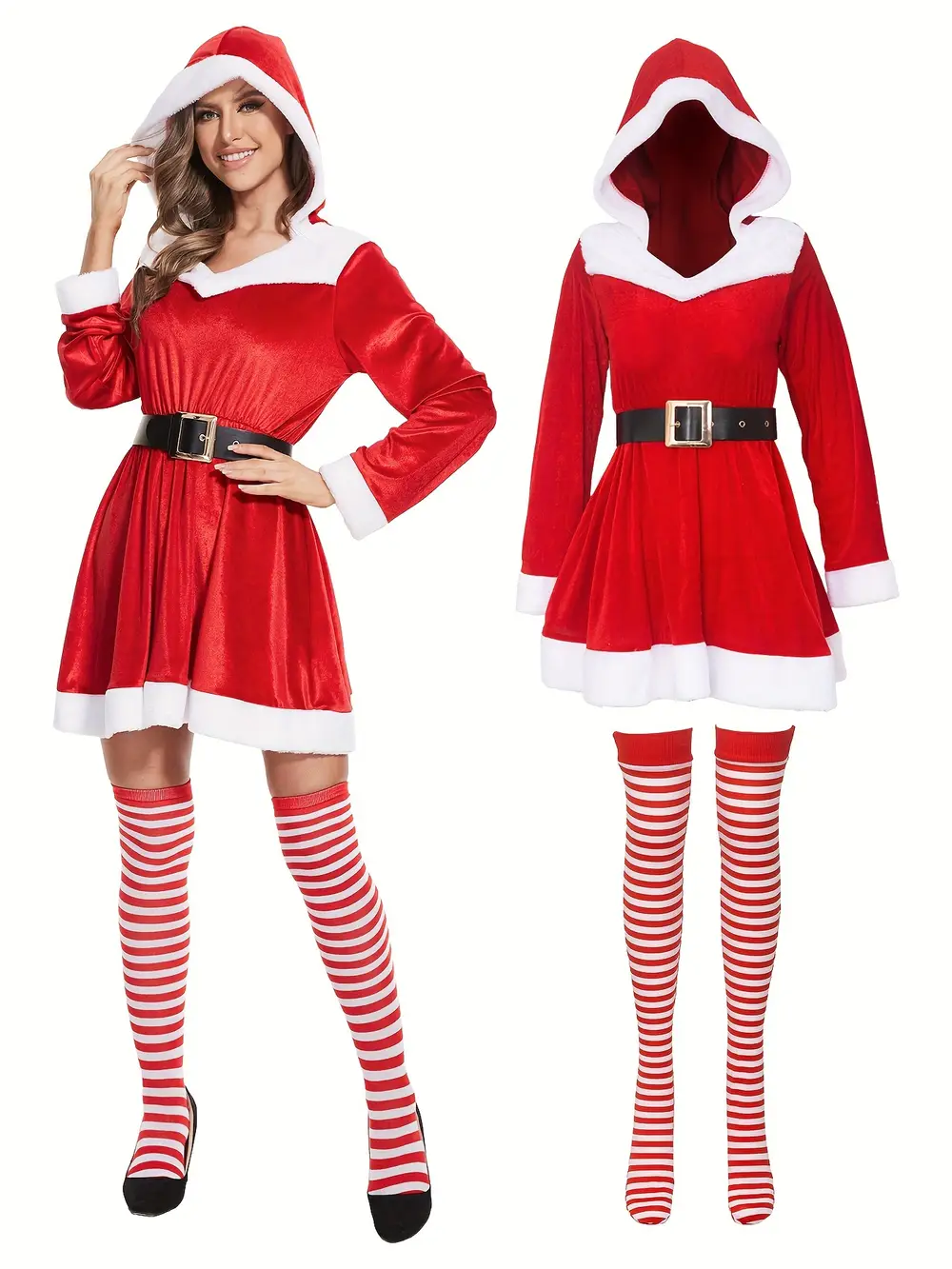 🎅 Robe de Noël à capuche au style décontracté 🎀 Avec ceinture et bas rayés inclus 🚚 Expédition sous 24h/48h 🎉 30 jours Satisfaite ou Remboursée