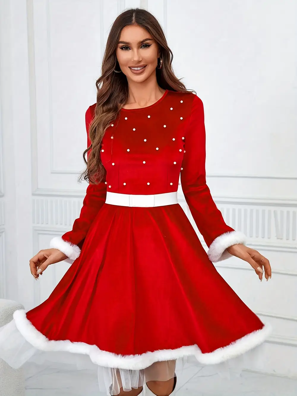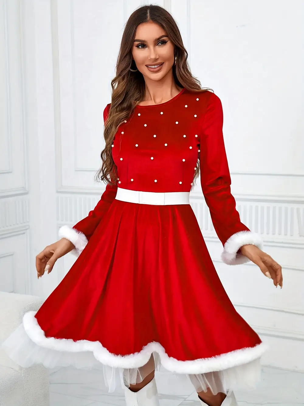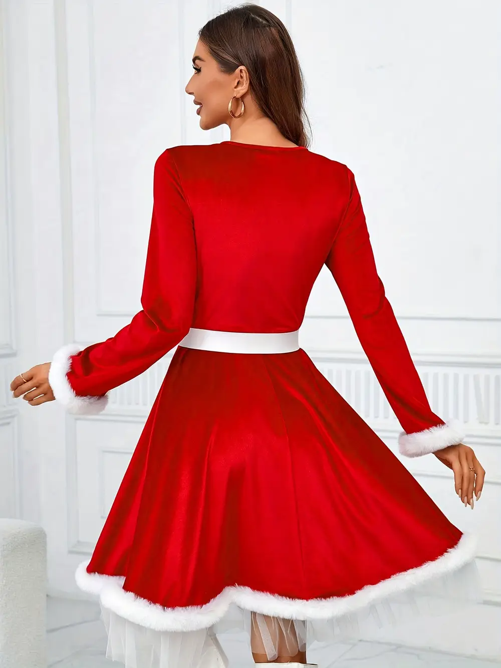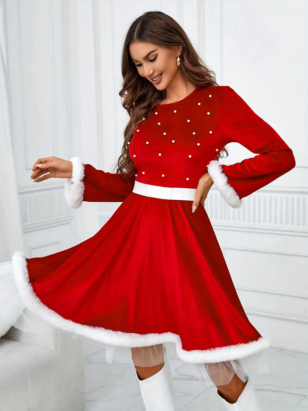 Robe de Noël femme style Père Noël – col rond, manches longues, fausse fourrure