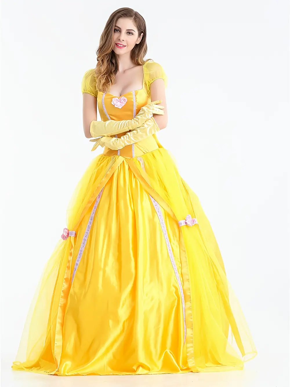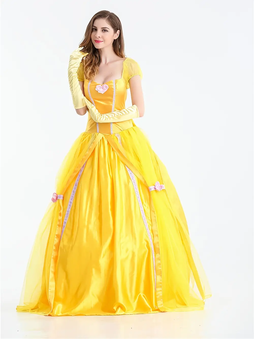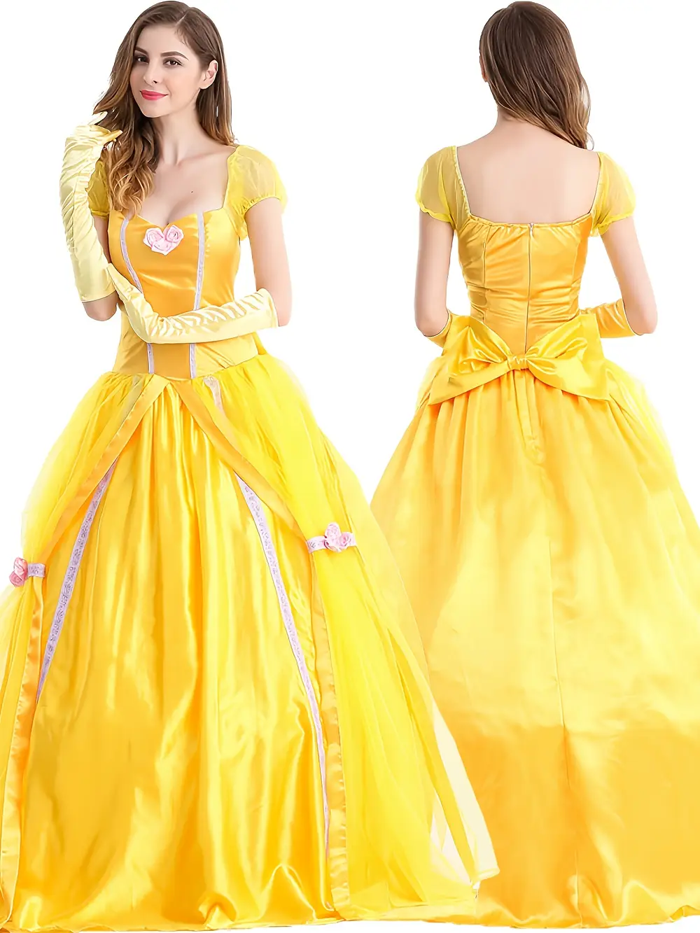 💛 Robe longue de princesse jaune au design féérique 🎀 Grand nœud détachable dans le dos inclus 🚚 Expédition sous 24h/48h 🎉 30 jours Satisfaite ou Remboursée