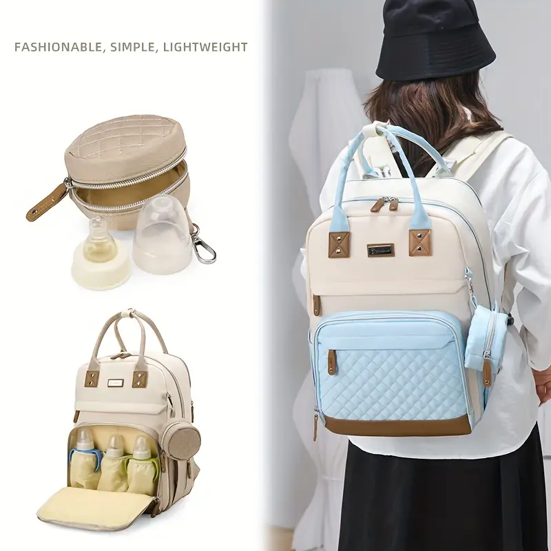 - Sac à langer beige et bleu au design ergonomique et élégant, adapté à tous vos déplacements
