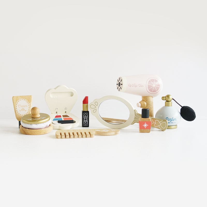 Destinés aux enfants dès trois ans, ces accessoires de beauté sont parfaits pour offrir les premiers outils de maquillage à une petite fille. Entièrement factices, ils permettent de s’amuser à se maquiller et à se coiffer comme une grande avec une grande variété d’ustensiles de beauté. Parmi eux, on trouve notamment un miroir, un parfum, un sèche-cheveux, un peigne, un rouge à lèvres, une palette de maquillage et bien d’autres encore que vous pourrez découvrir sur la deuxième photo.