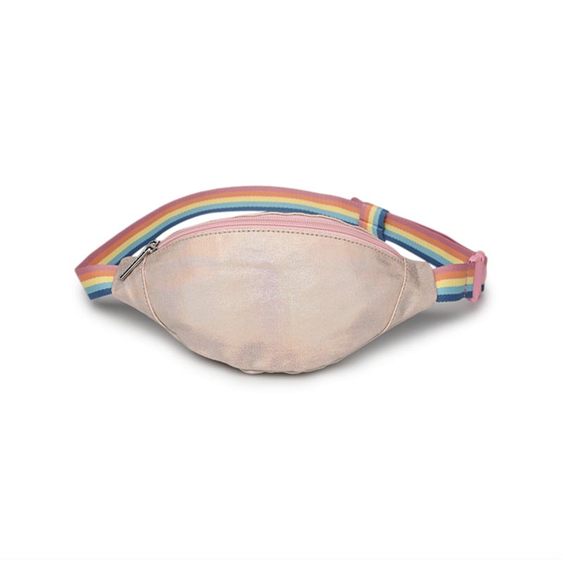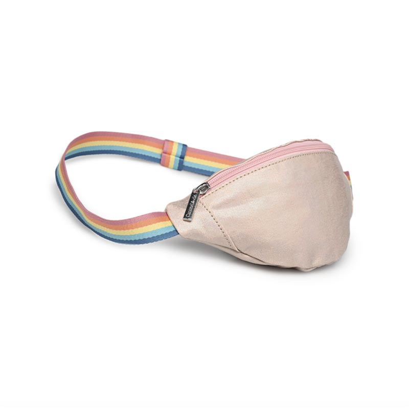 Sac enfant type «banane» à porter autour de la taille ou en bandoulière Modèle: Rose irisé Sangle réglable couleurs arc-en-ciel Dimensions : 25 cm x 10 cm x 7 cm Recommandé à partir de 4 ans Poche unique fermée par un zip Accessoire mode kid Design Caramel and Cie