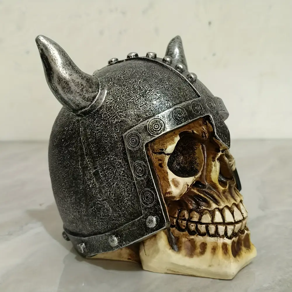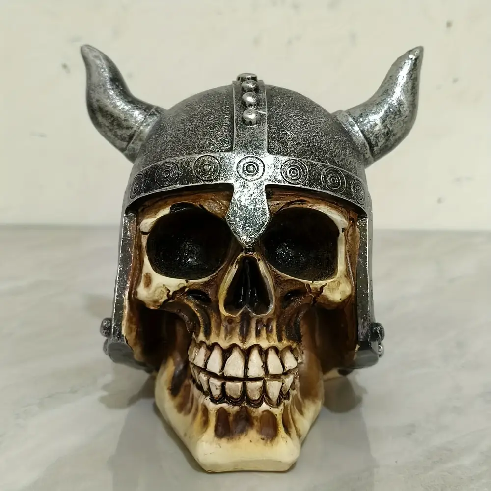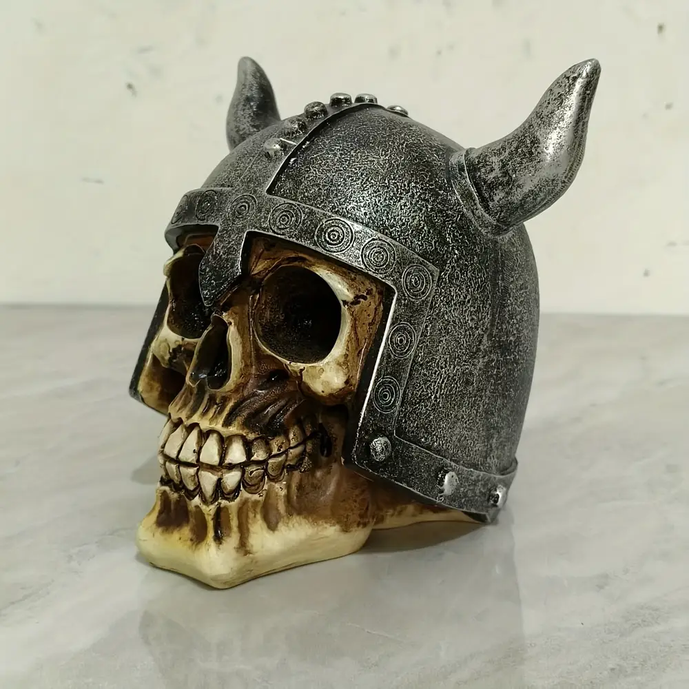 - Affirmez votre identité avec cette sculpture de crâne viking avec casque à cornes, symbole de bravoure et de mystères nordiques