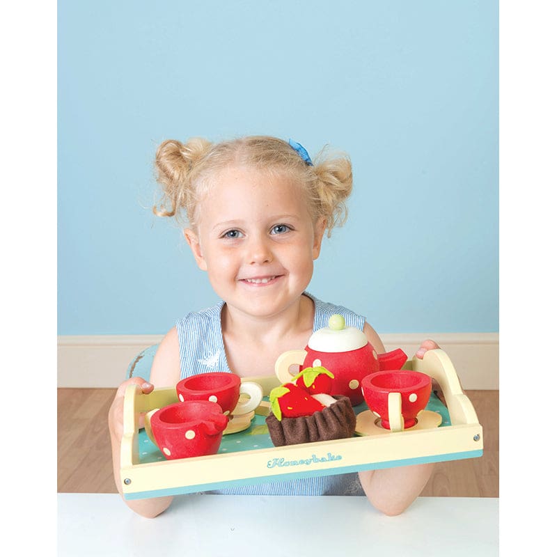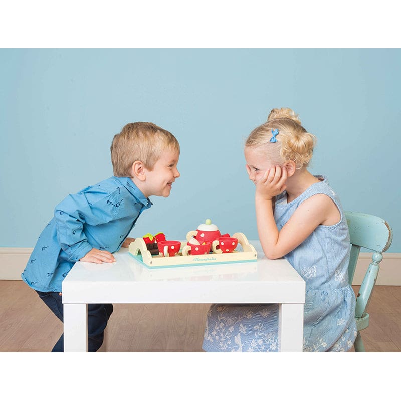 Ce set de thé comprend un plateau, trois tasses, une théière, une cuillère et une soucoupe pour présenter les deux fraises incluses dans ce coffret. Cet ensemble est parfait pour les enfants d’environ trois ans.