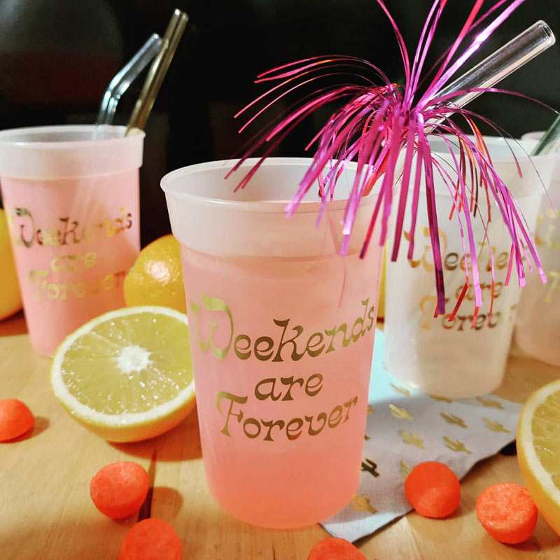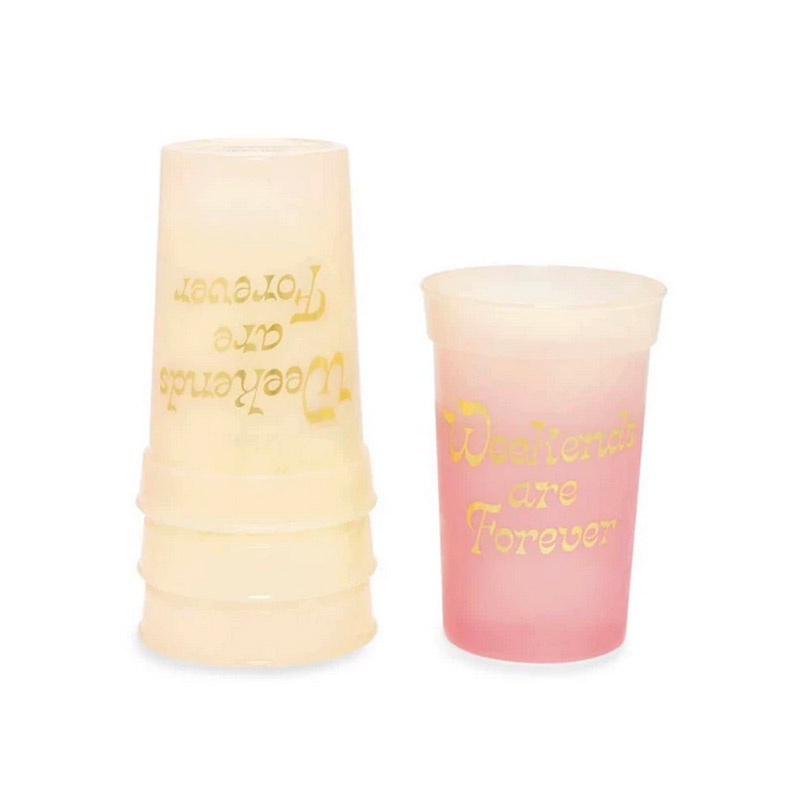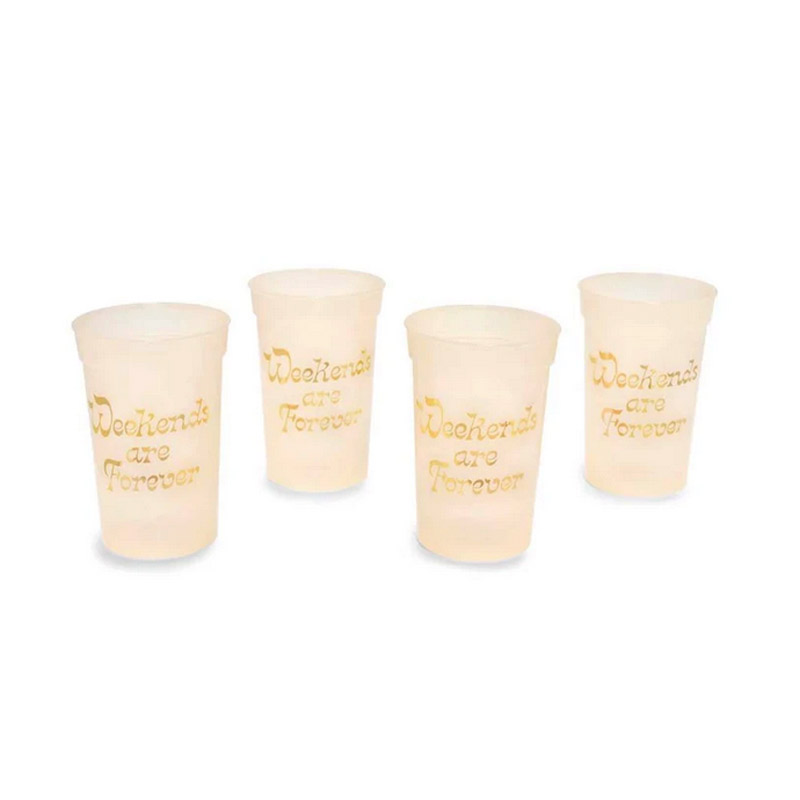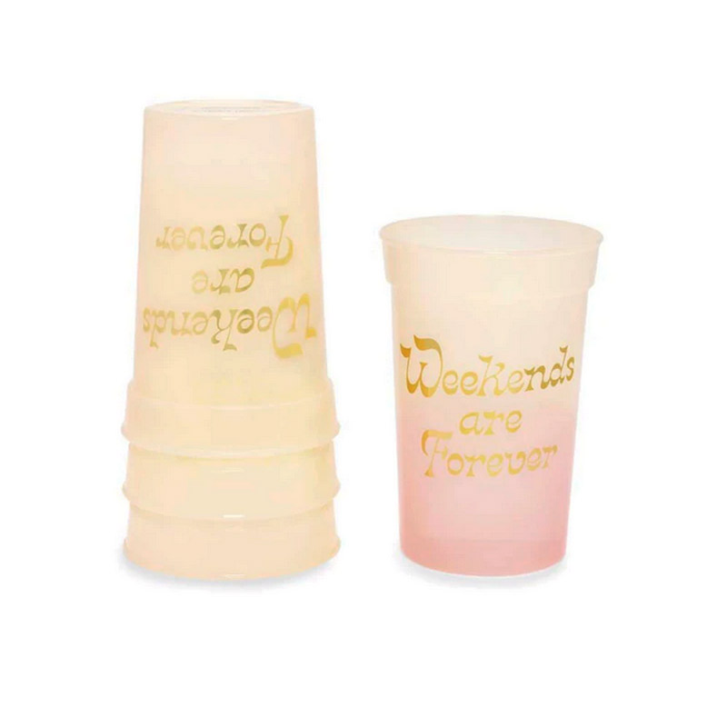 Set de 4 gobelets en plastique Changeant de couleurs lorsqu’on les remplit de liquide froid Message imprimé doré: Week-ends are forever Couleurs: crème devenant rose Lavage à la main uniquement, ne passe pas au lave-vaisselle Ne passe pas au micro-onde Design Ban Do, Los Angeles