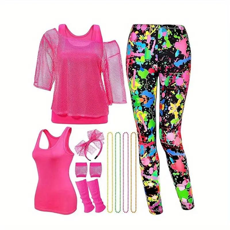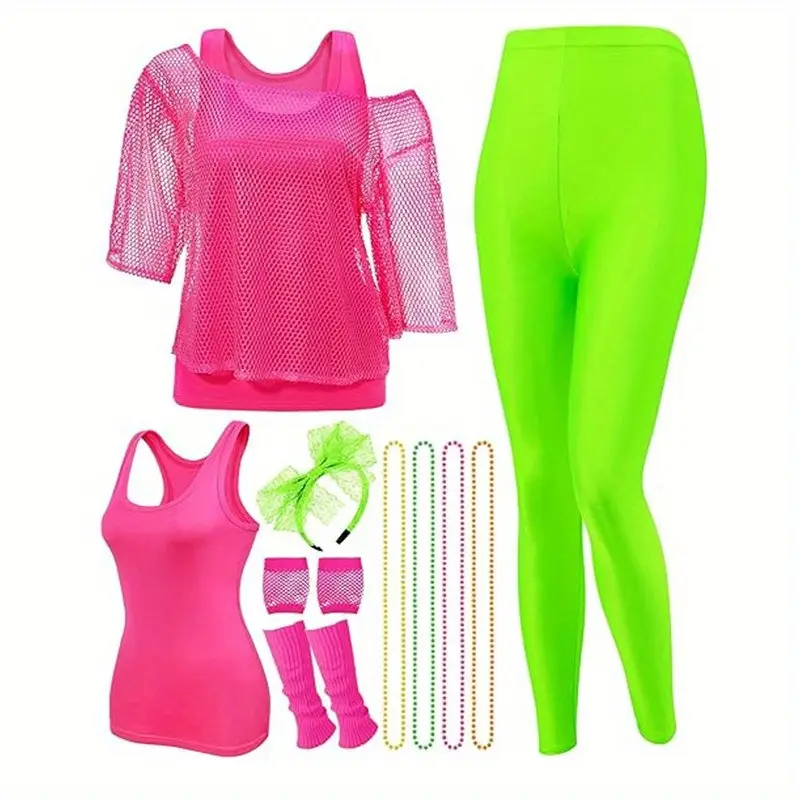 - Un ensemble de tenue de fête de danse rétro des années 80 – 12 pièces comprenant haut en filet, gilet, leggings fluo, gants résille, serre-tête et autres essentiels