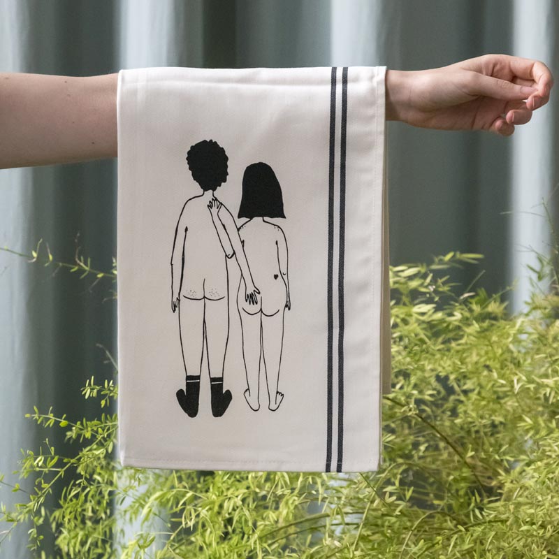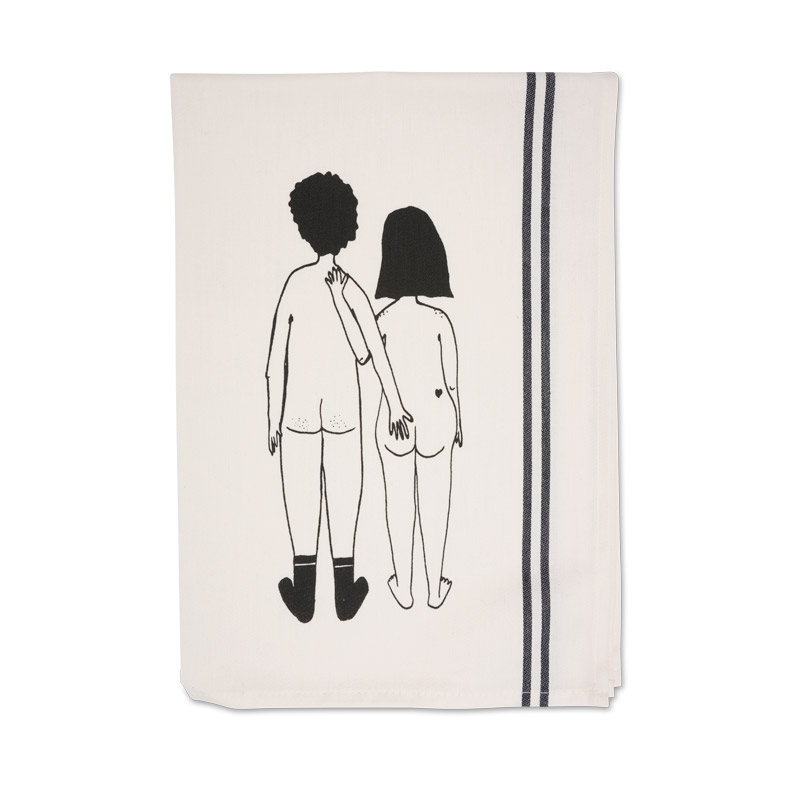Torchon de cuisine naked Couple, Illustration: Couple Nu de dos Matériaux: 100% coton organic Dimensions: 50 cm x 70 cm (gant à four et tablier assortis également disponibles) Fabriqué au Portugal et imprimé en Belgique avec des encres à base d’eau Design Helen B.
